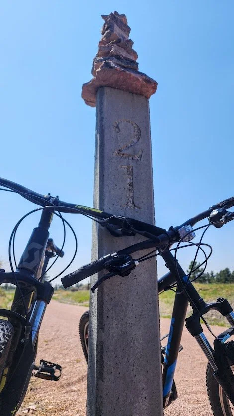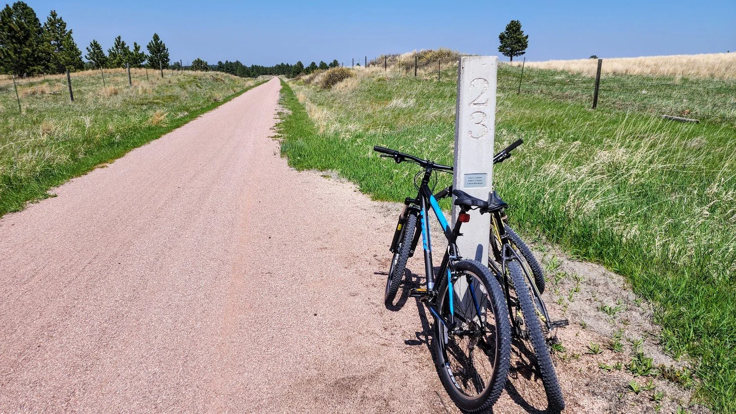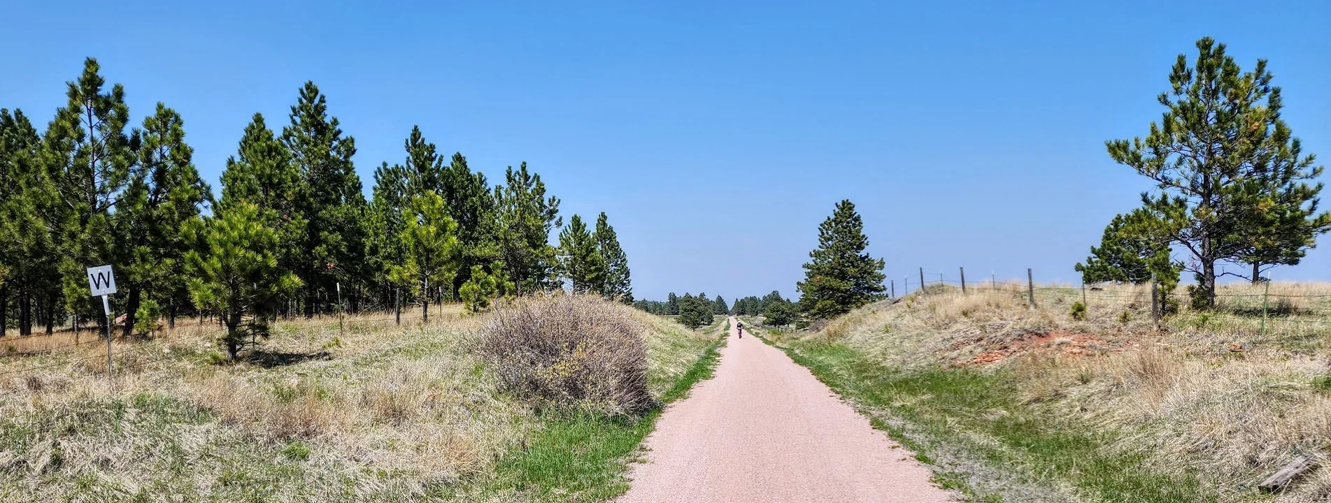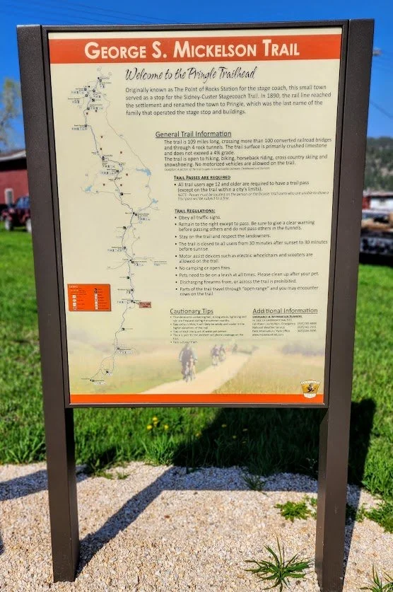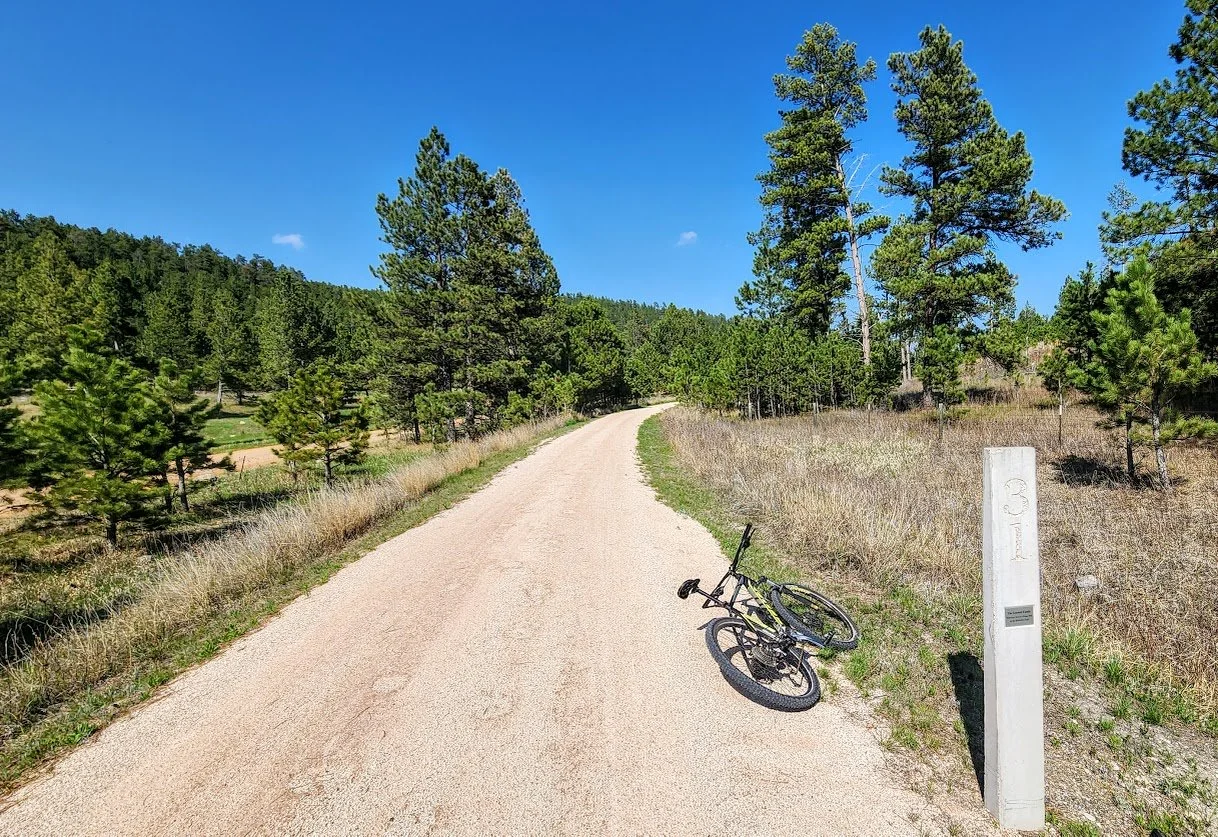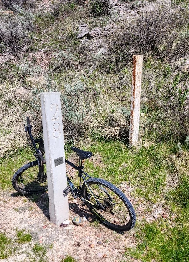 The trailhead is just short of 16 miles long (15.9) one way and goes mostly uphill the whole way. There is only 2 sections of this trail that go downhill - by MM 26 and by MM 31. This trail is one of my least favorite. It has a lot of open spaces, a very hot sun at times, and not much of scenery compared to the rest of the trail. The cool thing was in Pringle we were able to go to a bar and get a beer or even food if needed before the long bike ride back to the car. Also very little people ride this section of the trail, and we only saw 3 other people the whole time we were bike riding.