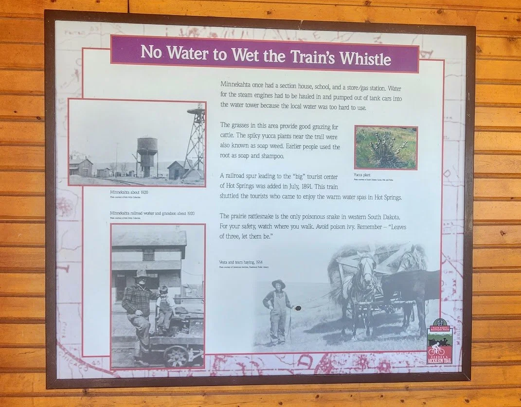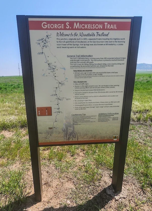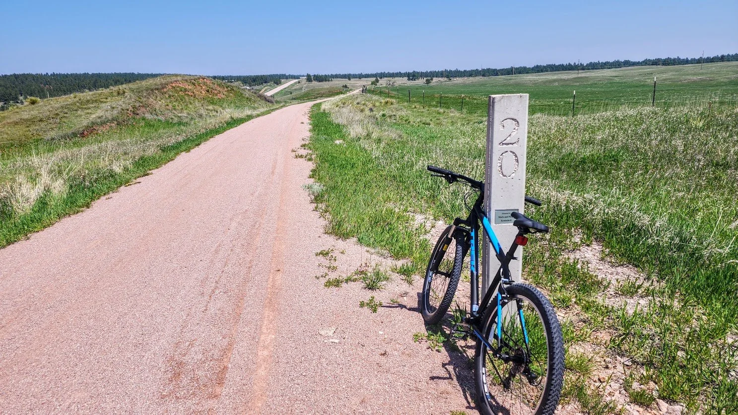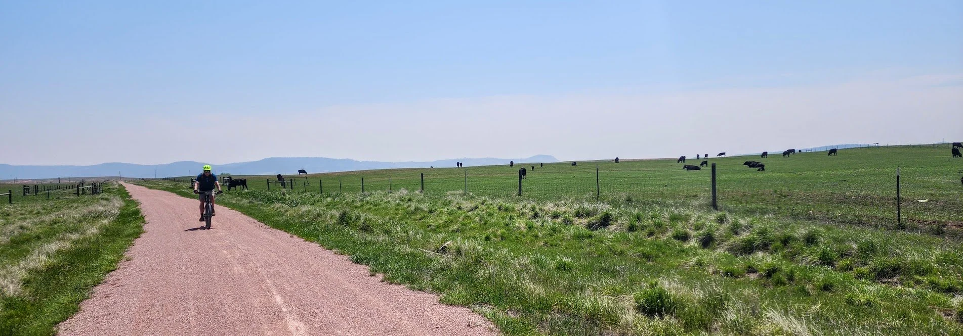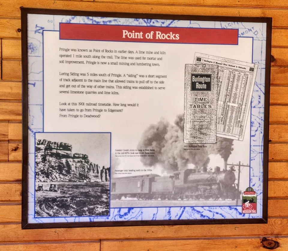 The trailhead is just short of 16 miles long (15.9) one way and goes mostly uphill the whole way. There is only 2 sections of this trail that go downhill - by MM 26 and by MM 31. This trail is one of my least favorite. It has a lot of open spaces, a very hot sun at times, and not much of scenery compared to the rest of the trail. The cool thing was in Pringle we were able to go to a bar and get a beer or even food if needed before the long bike ride back to the car. Also very little people ride this section of the trail, and we only saw 3 other people the whole time we were bike riding.