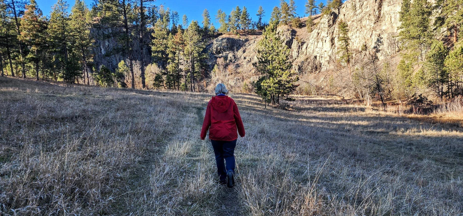To get to Victoria Lake Trail you need to take Sheridan Lake Road outside of Rapid City and follow it until you hit Victoria Lake road which is a dirt road that leads to the northwest. This is about 5 miles west of the city limits. From there take the road for several miles staying on the main road. When the road ends take the road to the left which will take you to a small lake/pond - Victoria Lake - and a small parking lot. The trail starts to the left and follows the canyon. We usually take the trail all the way till it hits a road and then head back. This is about a 2 to 3 mile out and back hike.