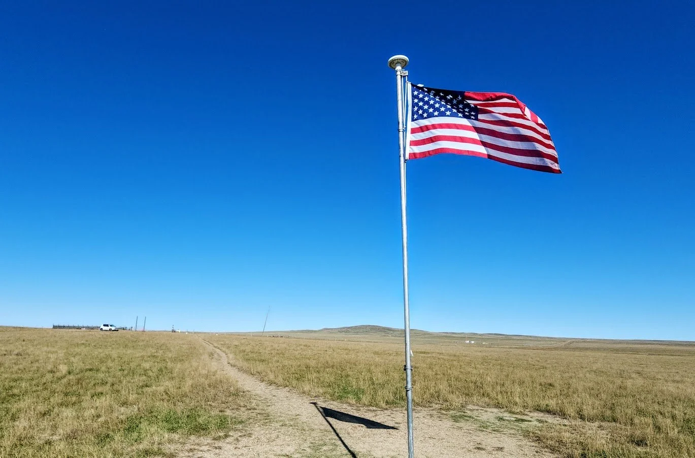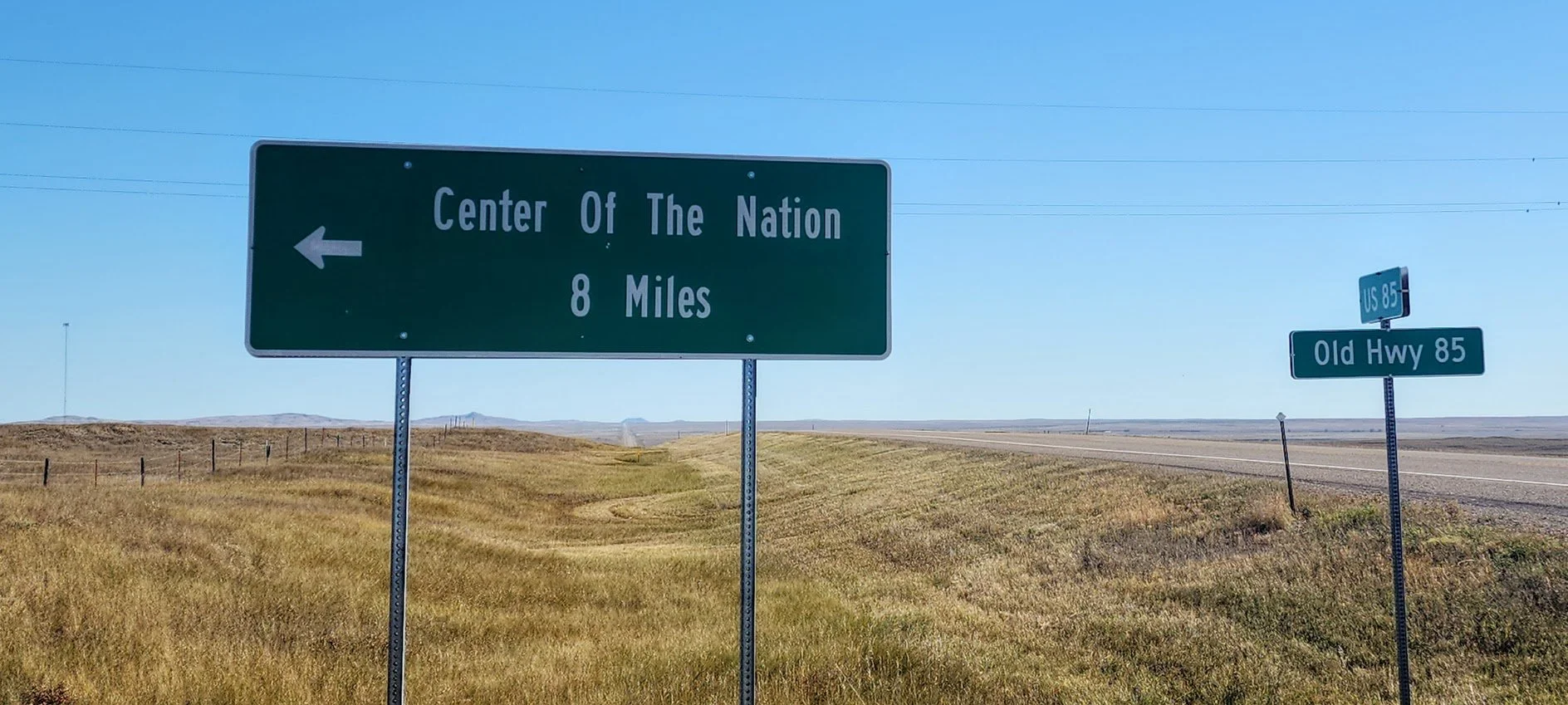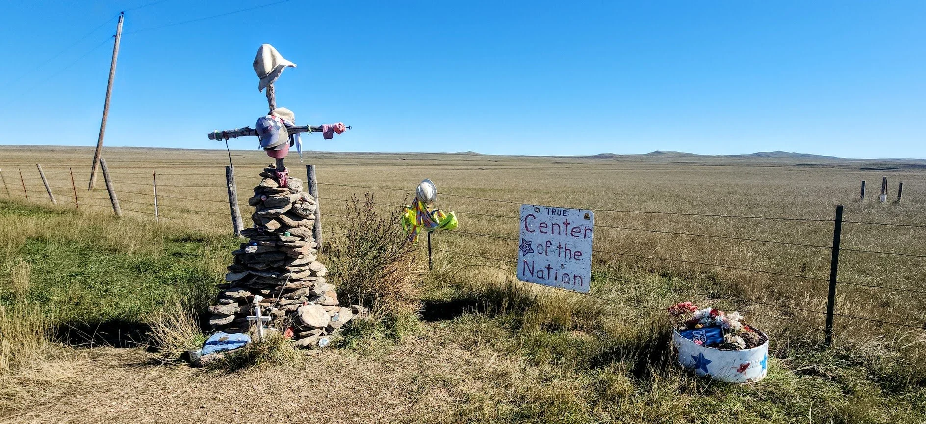 The geographical center of the entire United States, including Alaska and Hawaii, is located near Belle Fourche, South Dakota at approximately 44°58′N 103°46′W. There are 2 locations that mark this spot - one in the town of Belle Fourche (which is a tourist site), and then the actual true location about 20 miles north of Belle Fourche. The true location is in the middle of nowhere in a field, so it does not get as many visitors. This uninhabited private pastureland is about 12 miles east of the corner point where the South Dakota, Montana and Wyoming borders meet.