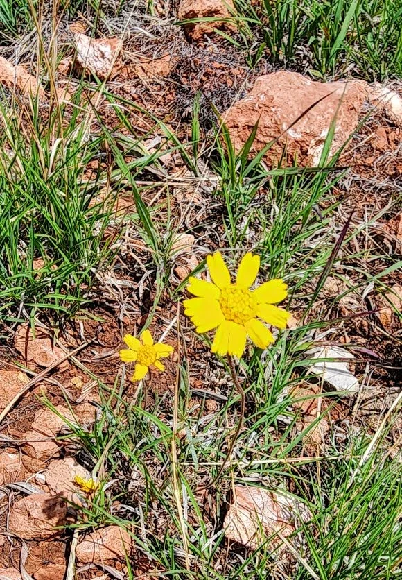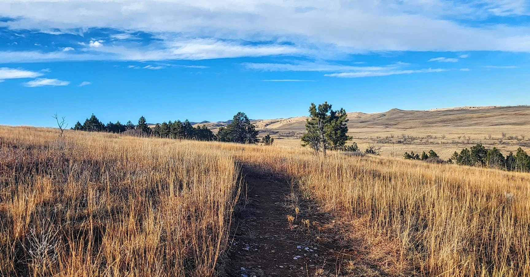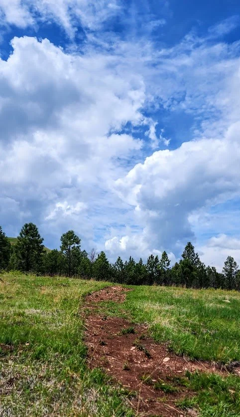 The Bison Trail/Red Dog Trail is the newest trail in Custer State Park and it is behind the Bison Center off Wildlife Loop Road. The sign splits the trail up in two sections - The Red Dog Trail and the Bison Trail. The sign says the total length to do the two trails is 2 miles and takes about 2 to 4 hours. Both trails are in a loop and can be done together. We did the trail in about 35 minutes and it was only .75 of a mile total, so not sure where the extra mileage is. This trail is also part of the summer and winter challenges for Custer State Park. This trail was pretty nice and had lots of different wildflowers and gorgeous open blue skies.