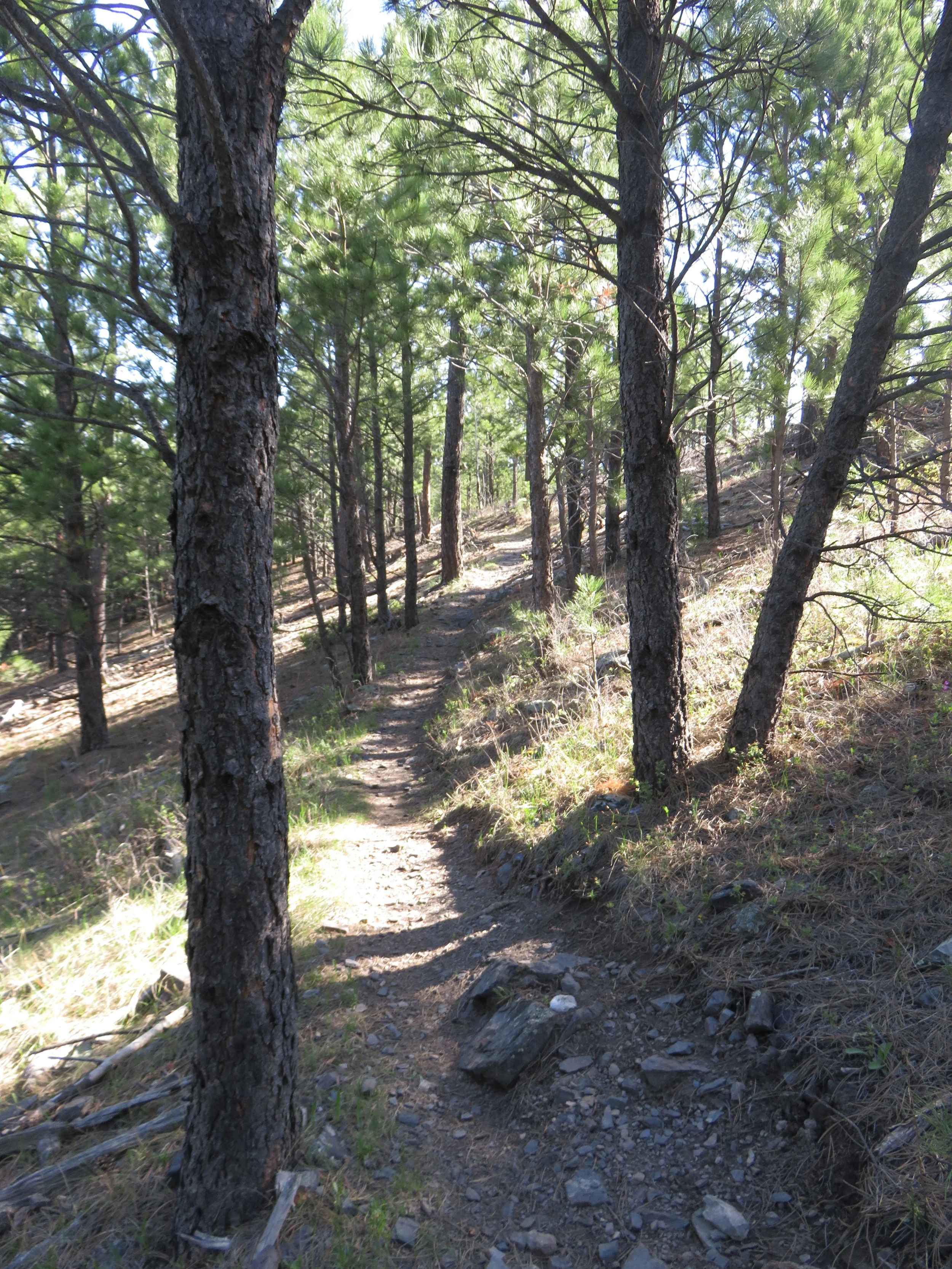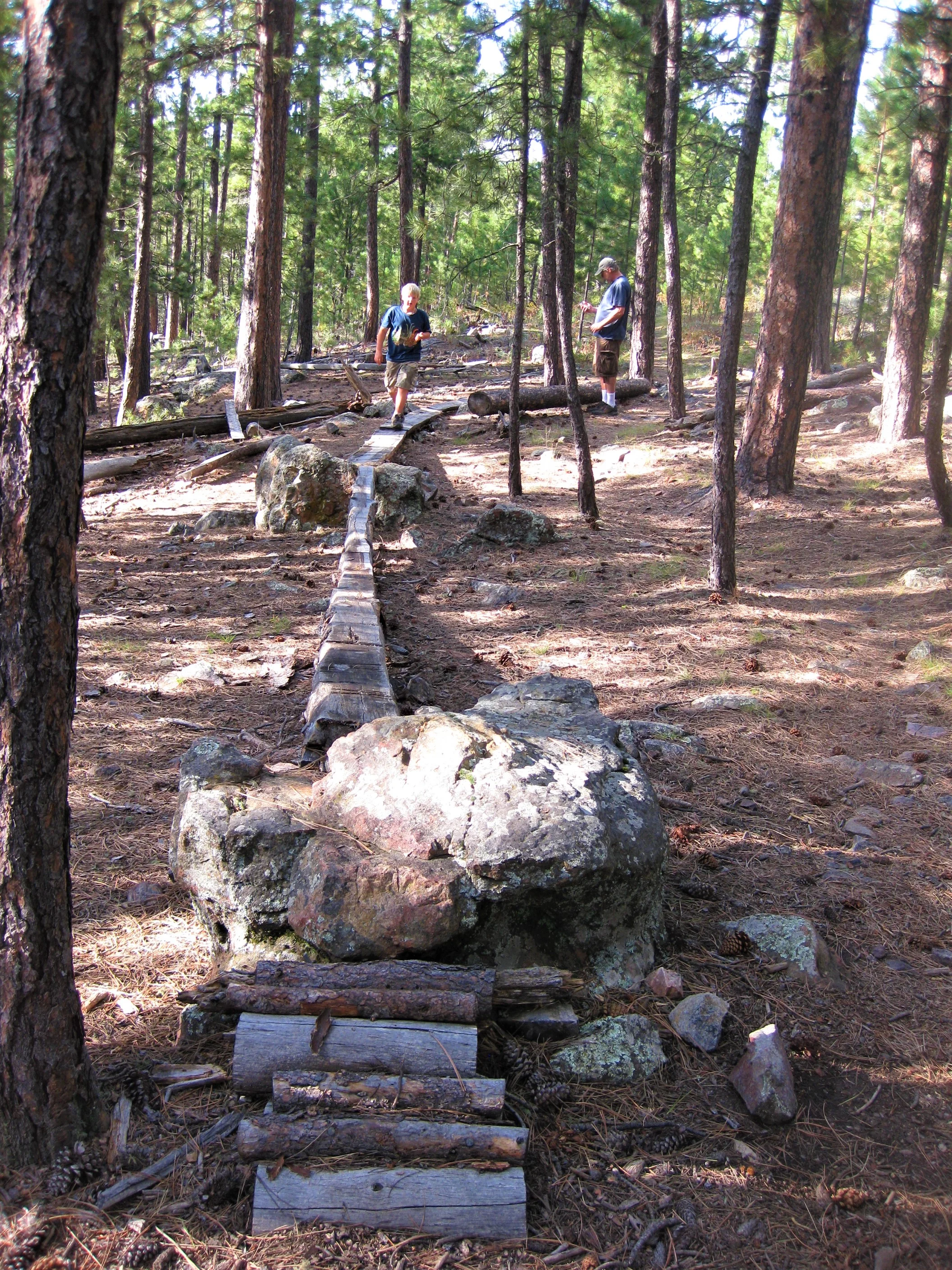 The lower parking area would be at these coordinates: N 44 05.070 W 103 25.408. Park then walk back down the road about 50 yards to find the trail. The upper trail parking is located at: N 44 05.311 W 103 25.624 From here you cross the fence and walk for about 100 feet till you find the trail. You can do a loop hike of about 2 miles should you want to walk the entire trail. Start on one end and then you will need to walk the road back to you car. This road is closed to motorized traffic from November 15 to May 15 each year.