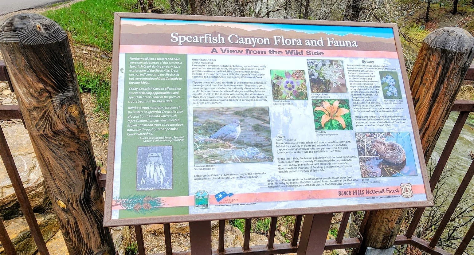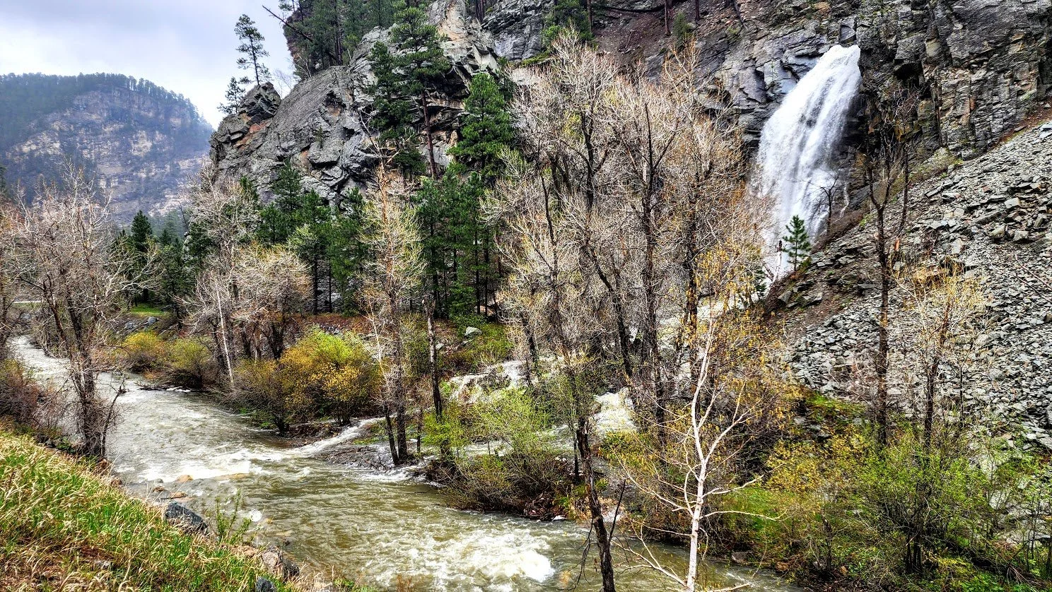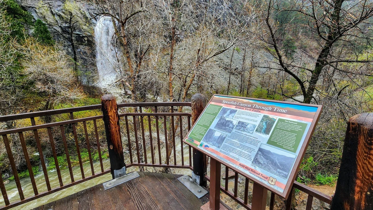 Bridal Veil Falls can easily be seen in Spearfish Canyon on US Hwy 14A. It is about 15 minutes from Spearfish. The 60 foot waterfall is usually best in the spring when the winter snow melts. During winter it is popular with climbers. There is a place to park and get out and view the falls.