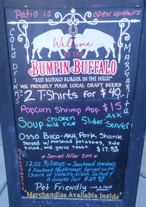 Bumpin Buffalo Bar And Grill is located in downtown Hill City, South Dakota. They have a variety of food items, a full bar, different seating sections, and an upstairs outside patio. I really enjoyed the patio and it gives you a great view of the town. The food was really good and the beer was really cold. It is a nice place to stop when in the hills.