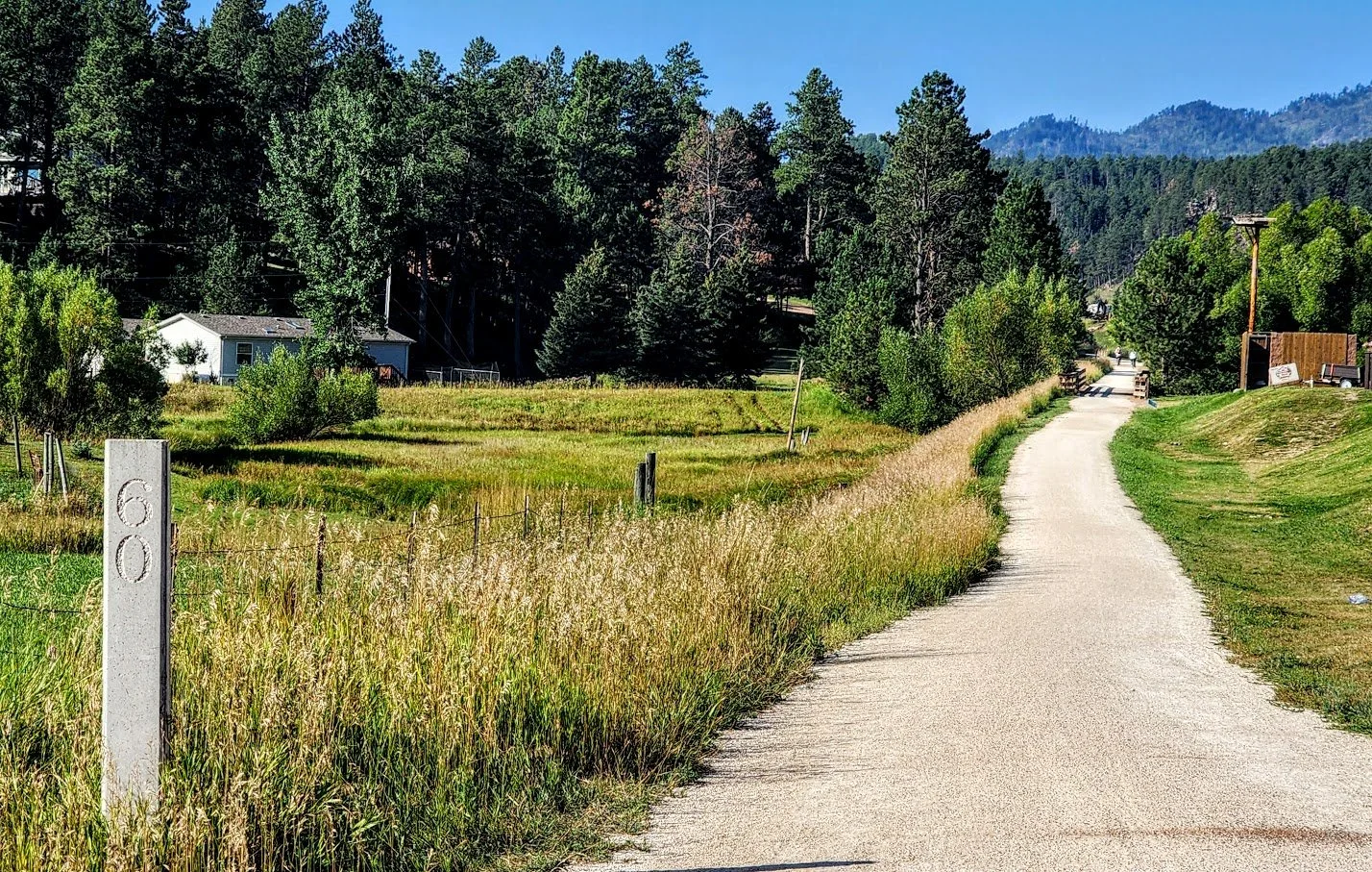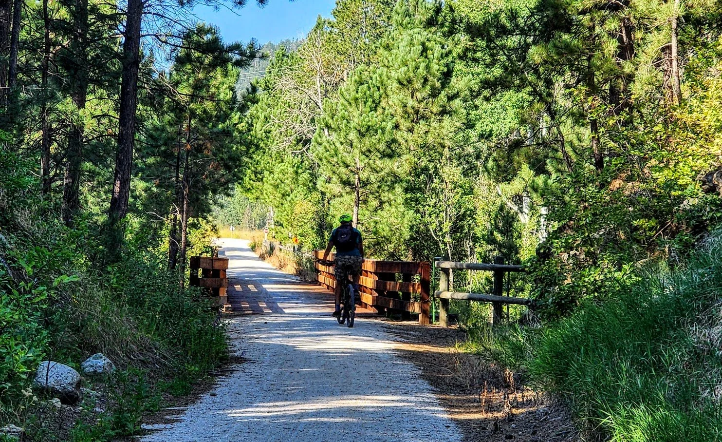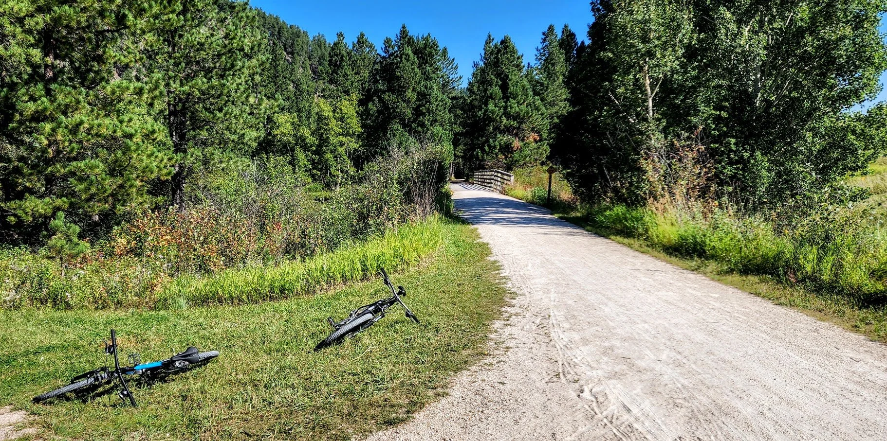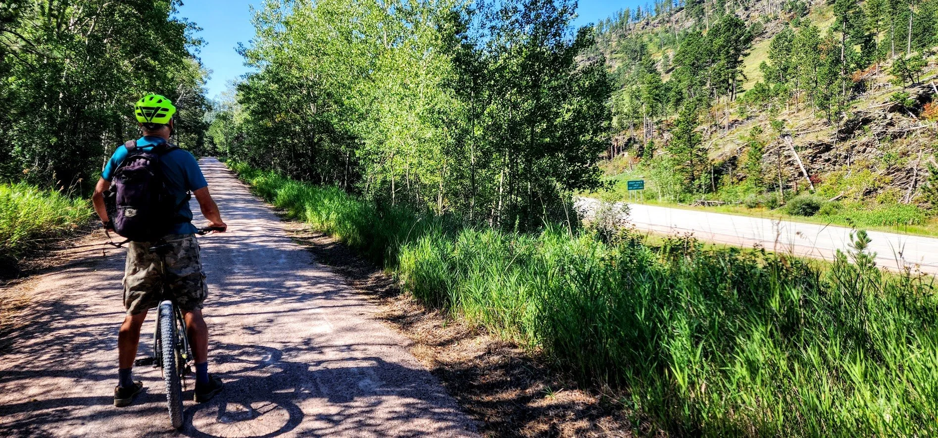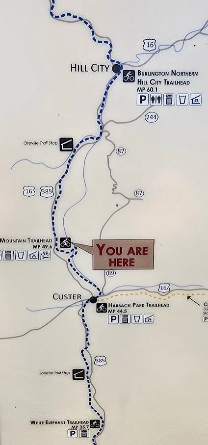 The Burlington Northern Hill City Trailhead starts at MM 60.1 in Hill City and goes to MM 49.6 at the Mountain Trailhead just south of Crazy Horse Monument. It goes pretty much uphill the whole way until you hit Crazy Horse and then it goes down the last 3/4 of a mile until it hits the next trailhead. We did this 10.5 mile trailhead starting at Hill City and then turning around. The 2 miles going up to Crazy Horse are the worst since it is at a steeper slope and you can be exposed to the sun at certain times of the day. Once you turn around at the Mountain Trailhead and get back to Crazy Horse, you pretty much glide back down to Hill City making it the best part of the trip.