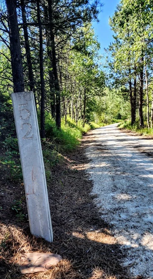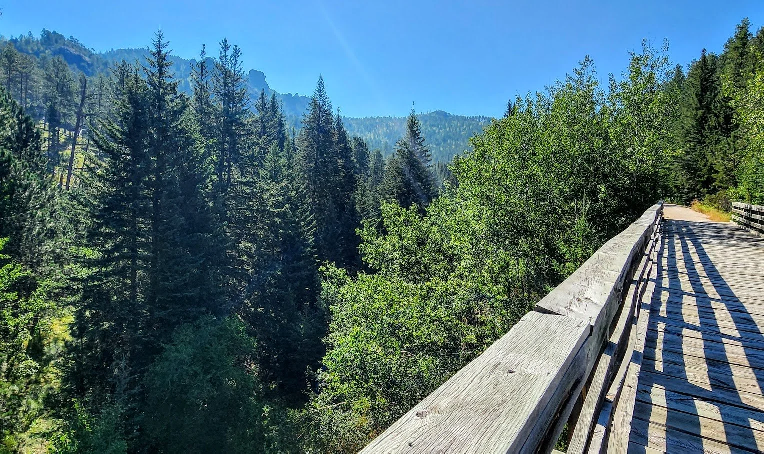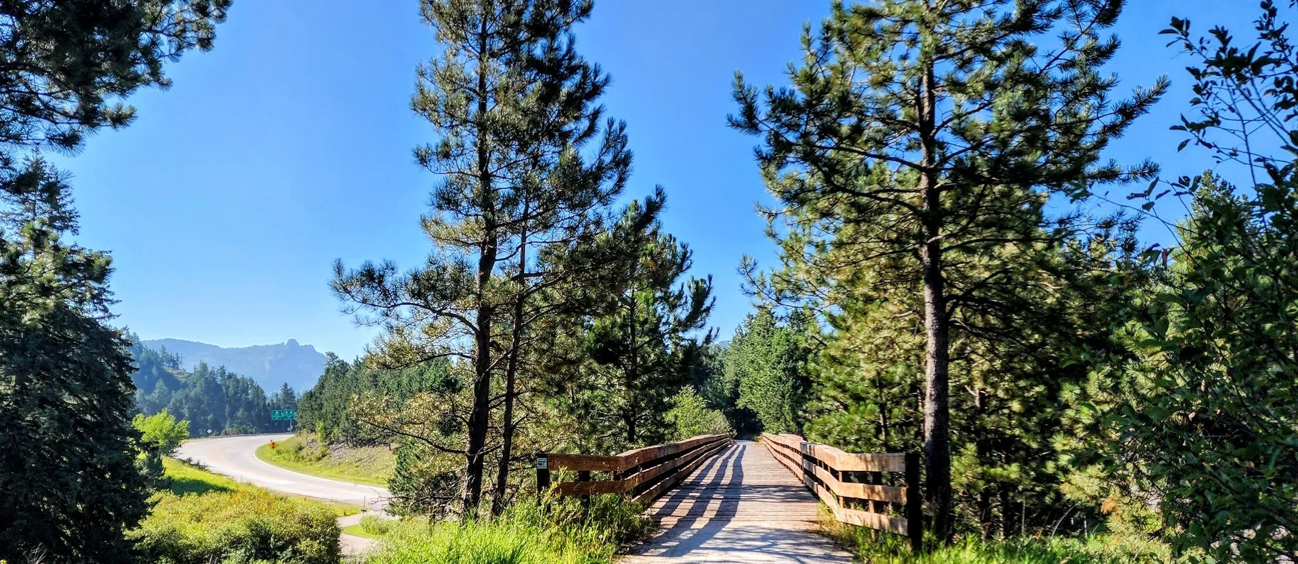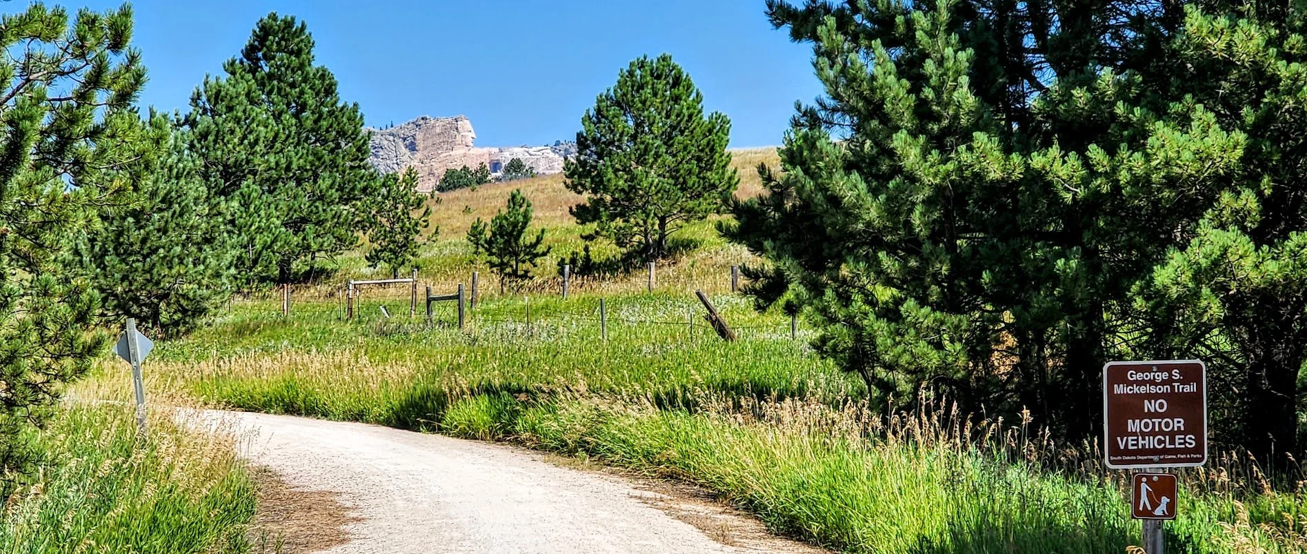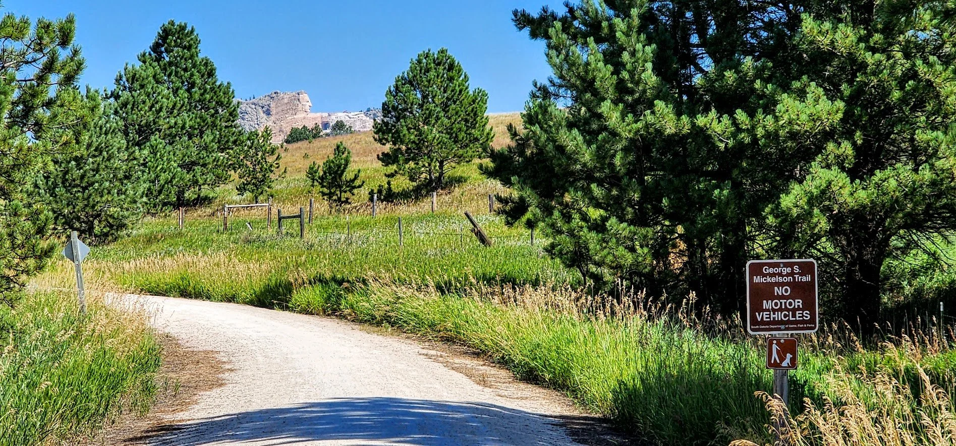 The Burlington Northern Hill City Trailhead starts at MM 60.1 in Hill City and goes to MM 49.6 at the Mountain Trailhead just south of Crazy Horse Monument. It goes pretty much uphill the whole way until you hit Crazy Horse and then it goes down the last 3/4 of a mile until it hits the next trailhead. We did this 10.5 mile trailhead starting at Hill City and then turning around. The 2 miles going up to Crazy Horse are the worst since it is at a steeper slope and you can be exposed to the sun at certain times of the day. Once you turn around at the Mountain Trailhead and get back to Crazy Horse, you pretty much glide back down to Hill City making it the best part of the trip.