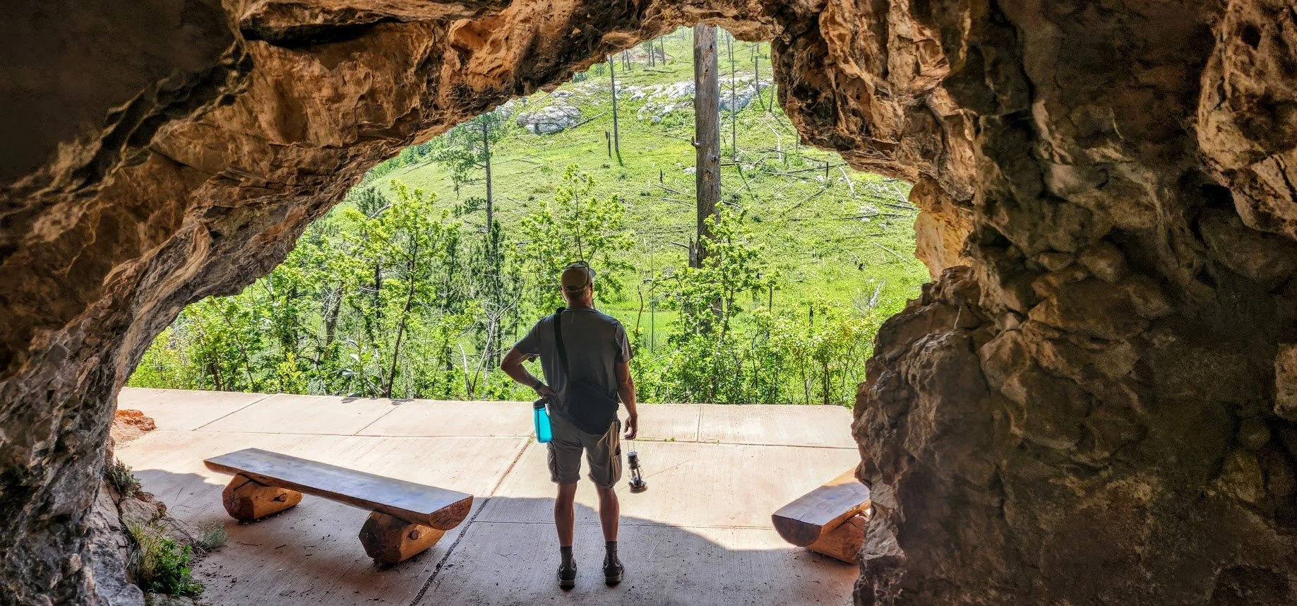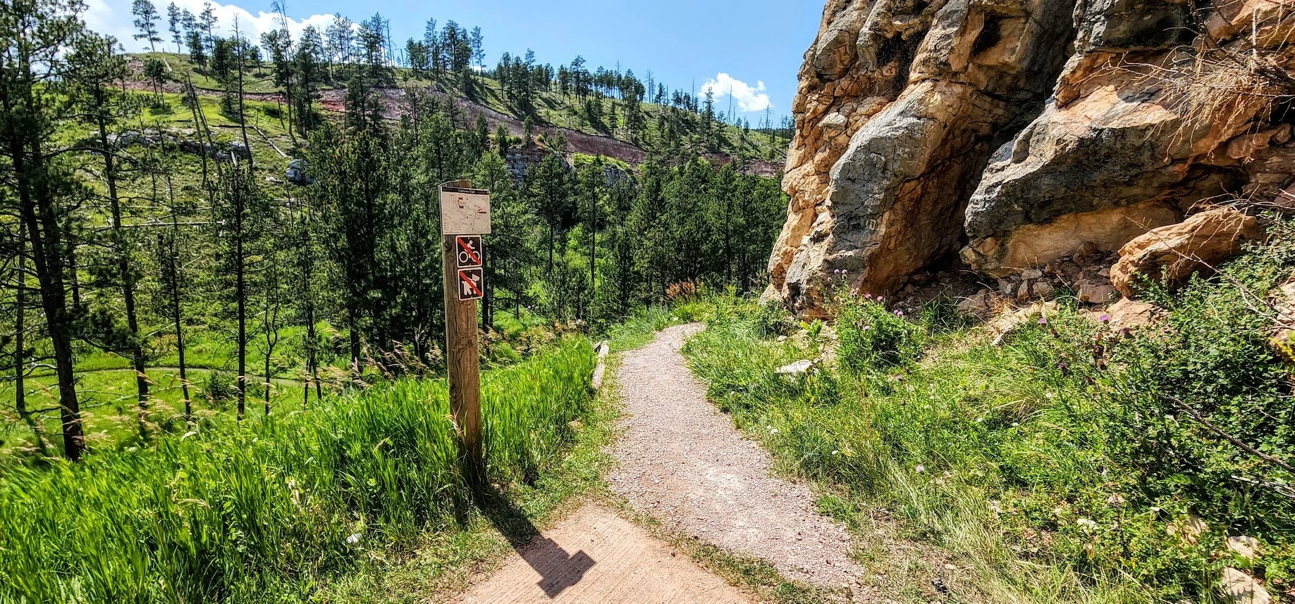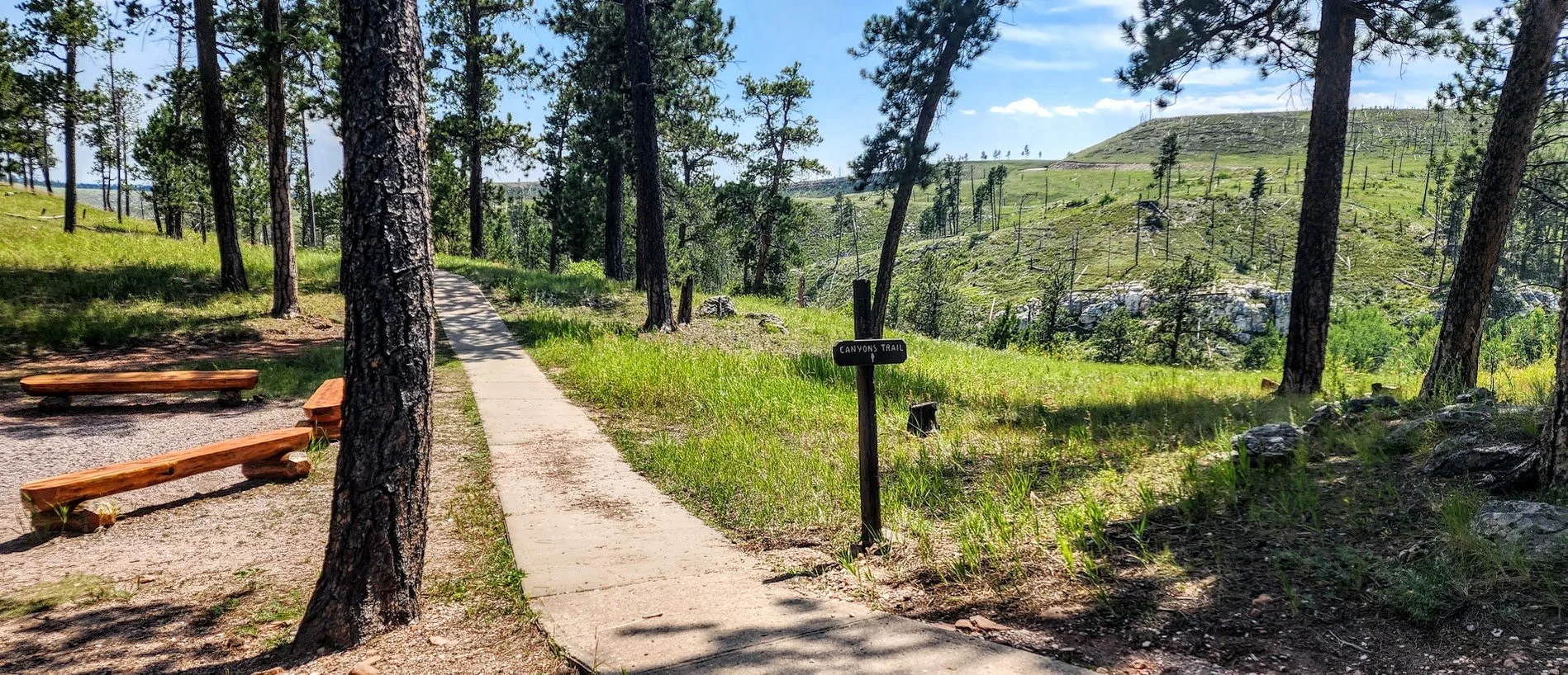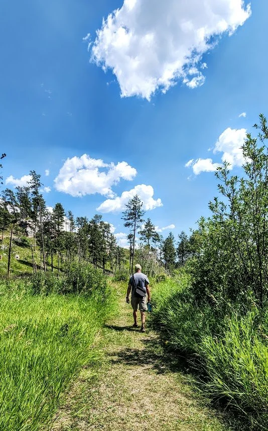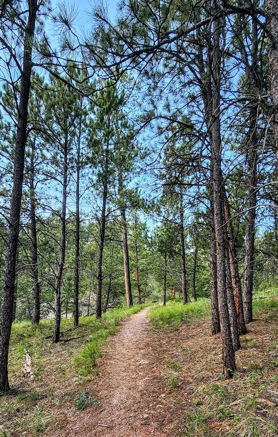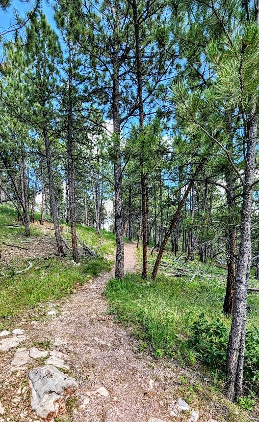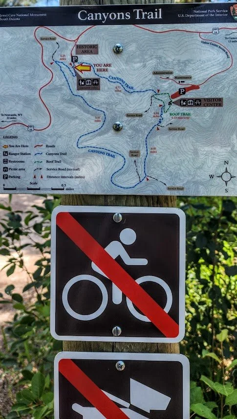 The Canyons Trail is a 3.5 mile loop that is near Jewel Cave National Monument. It starts at the picnic area near an old historic cabin. The trail descends down some stairs to a couple of cave openings which are pretty cool. The trail then meanders through an open canyon for a bit until it goes back into the trees. The canyon can get pretty hot since there is little shade. This trail also meets up with the Roof Trail once near Jewel Cave. The trail was a peaceful and pretty easy trail, and we saw almost no one while on it.