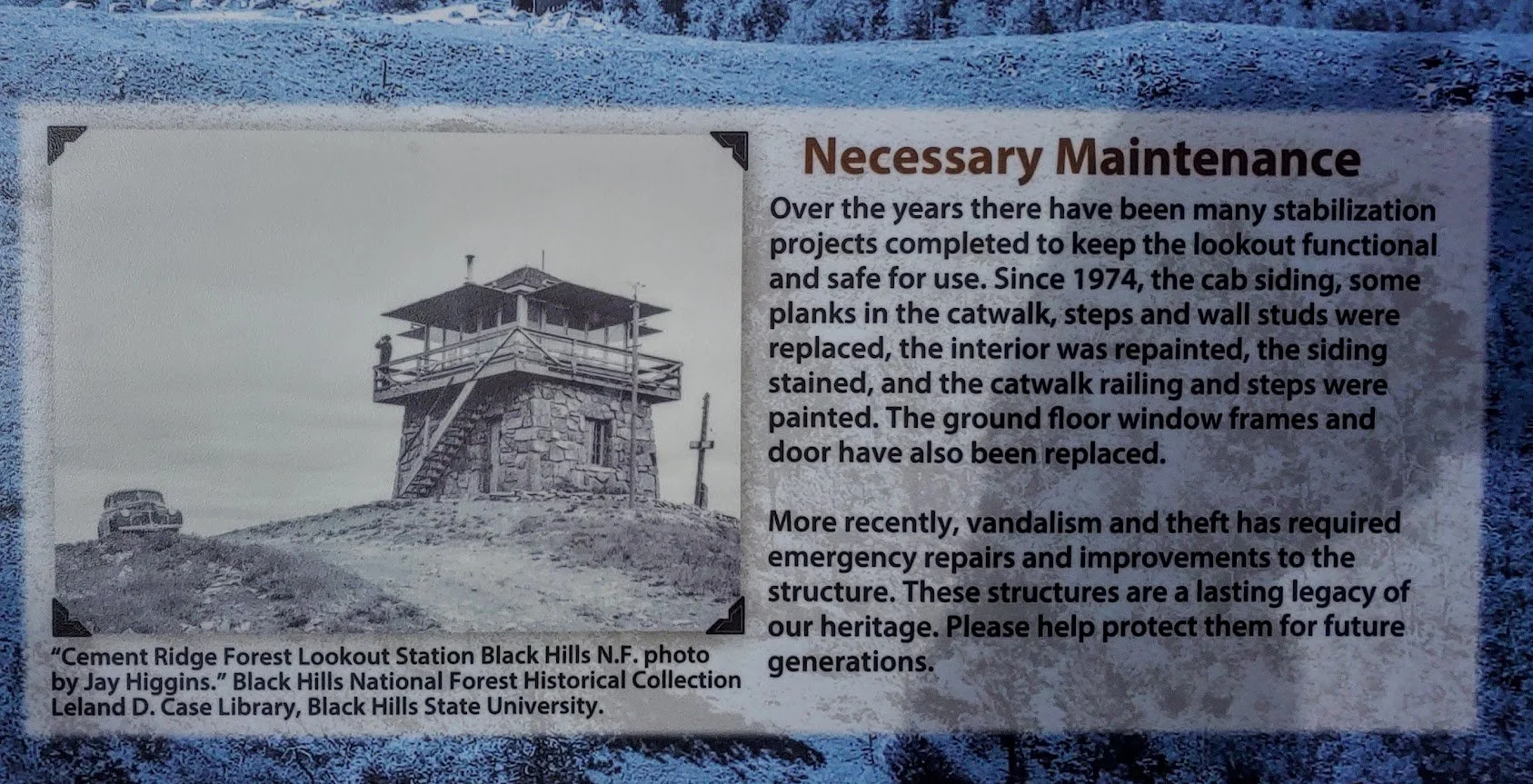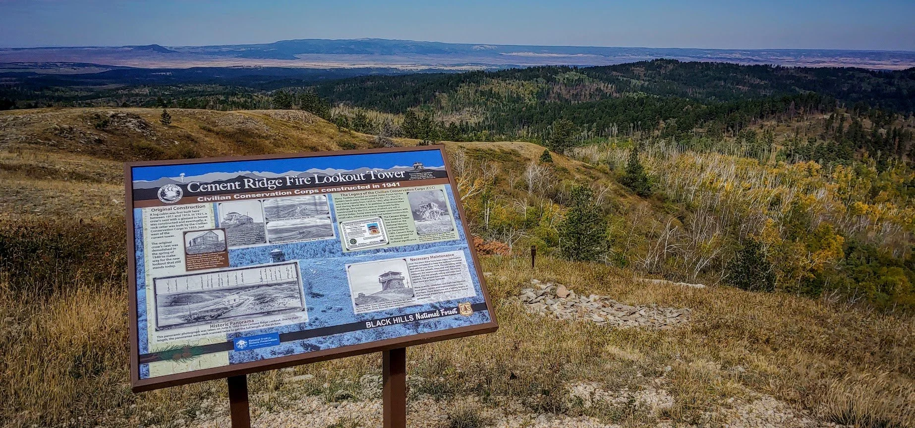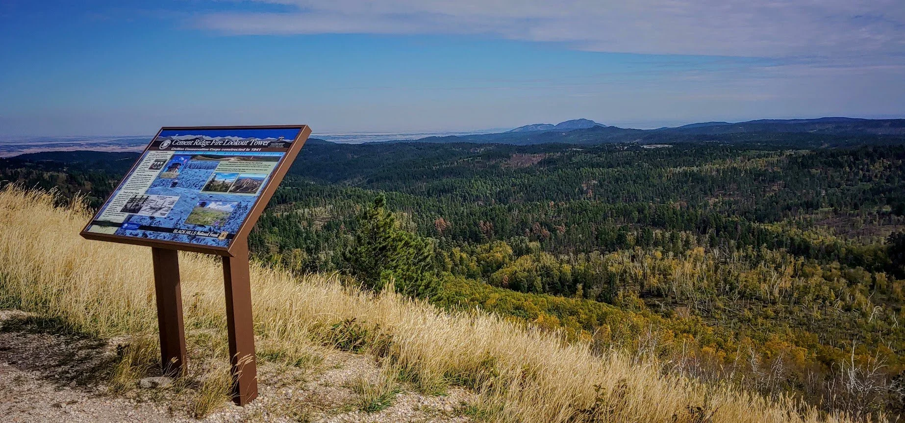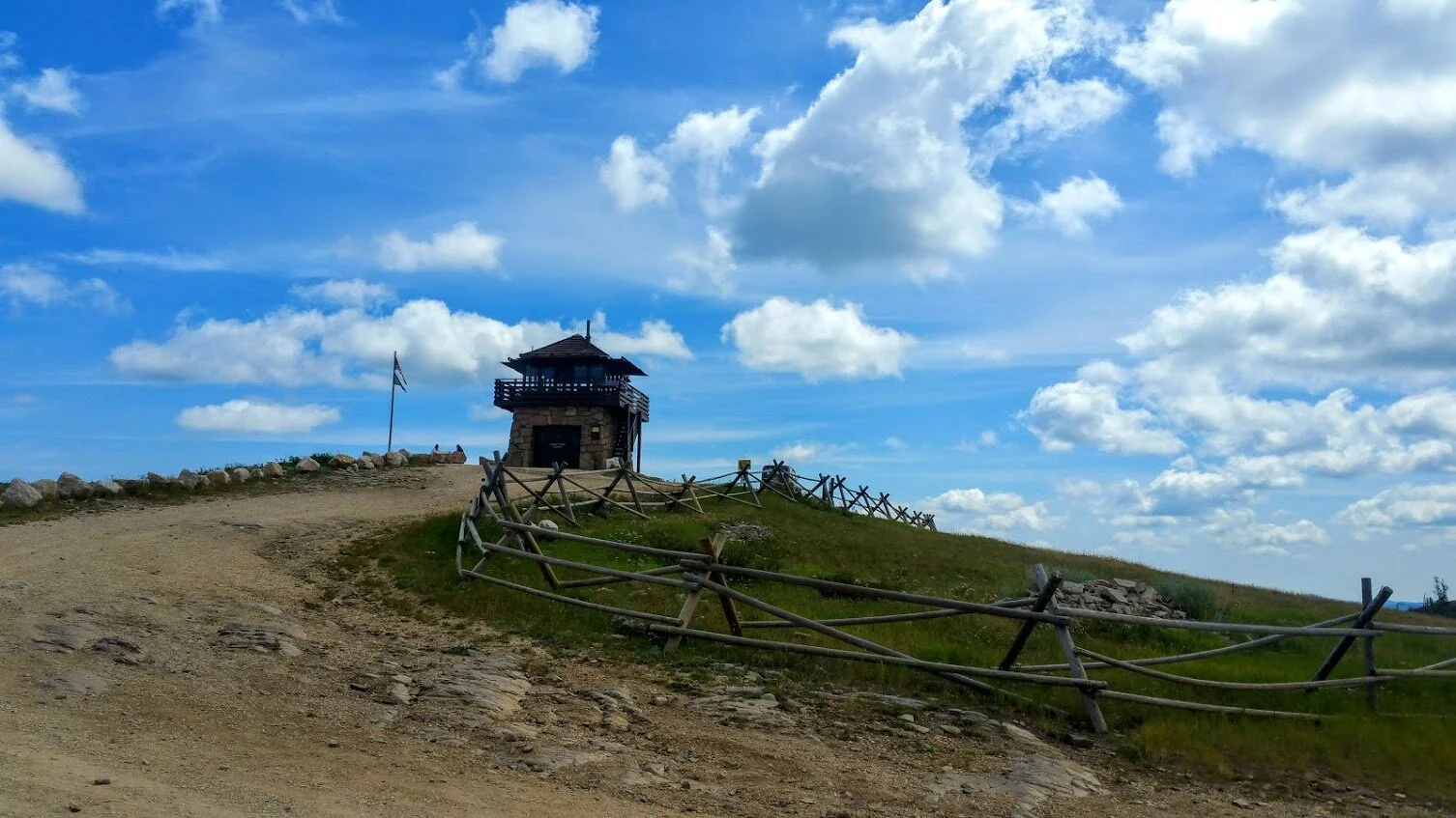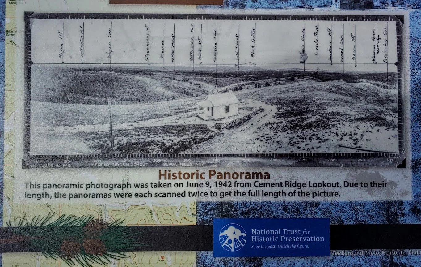 Cement Ridge Fire Lookout Tower is a really neat place to visit. The turnoff to the tower is just down the road from Roughlock Falls in Spearfish Canyon. The tower itself is actually in the Black Hills of Wyoming. We have lived in the hills for over 30 years and I did not realize how close Wyoming was to Spearfish Canyon, nor did I ever visit this fire tower before. The drive to the tower was on a beautiful dirt road where we saw some old cabins (private property). The road turnoff to the tower itself was lined with summer flowers - the most flowers I have seen in the Black Hills. The road to the tower was pretty good this time of year. I would not want to be in a low riding vehicle though, and if you are concerned about your car, you can park close to the end and walk the rest of the way, but I was in a jeep and had no problem. People also in mini vans made it to the top.