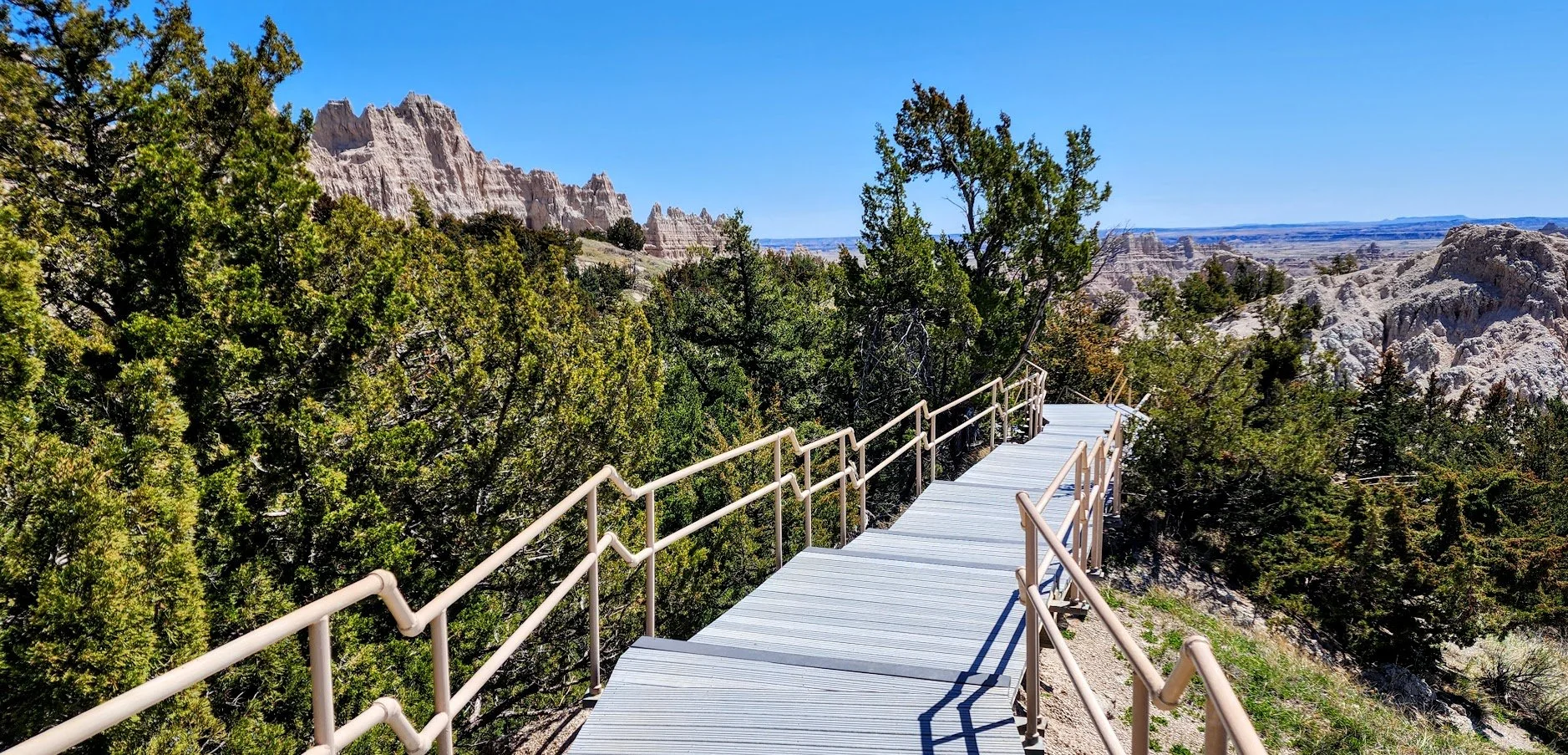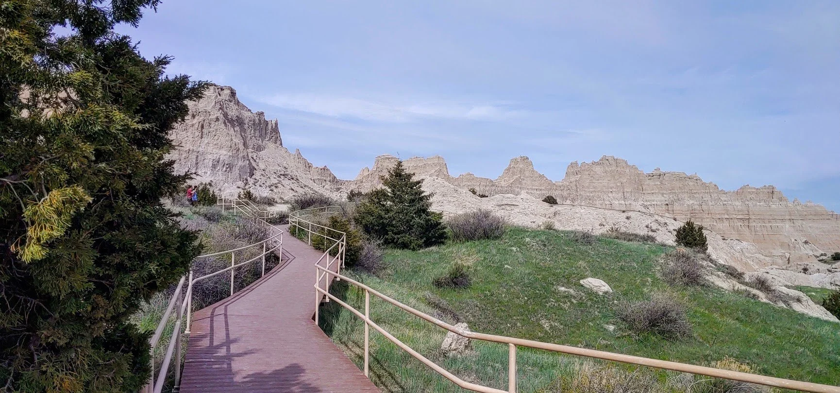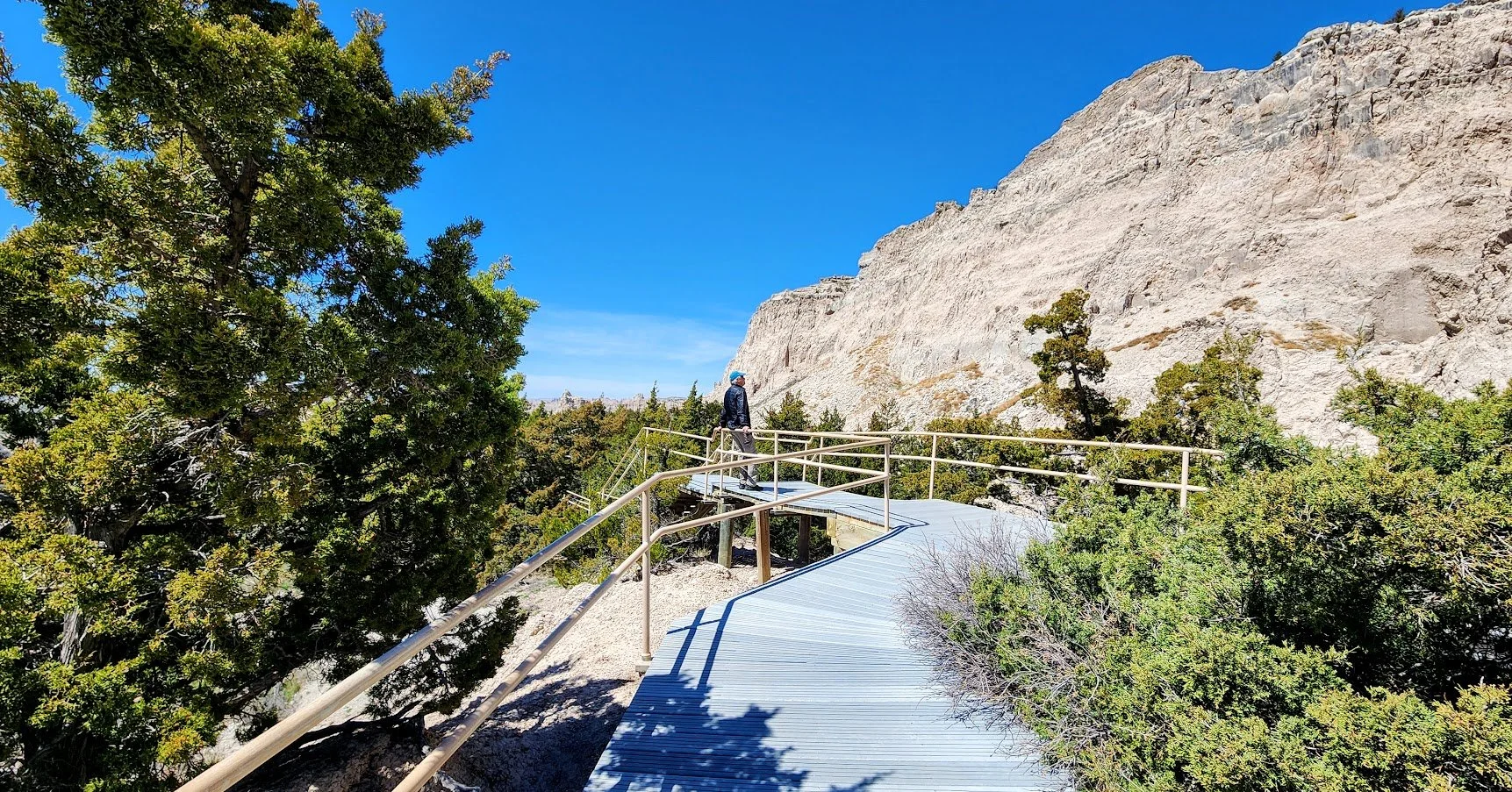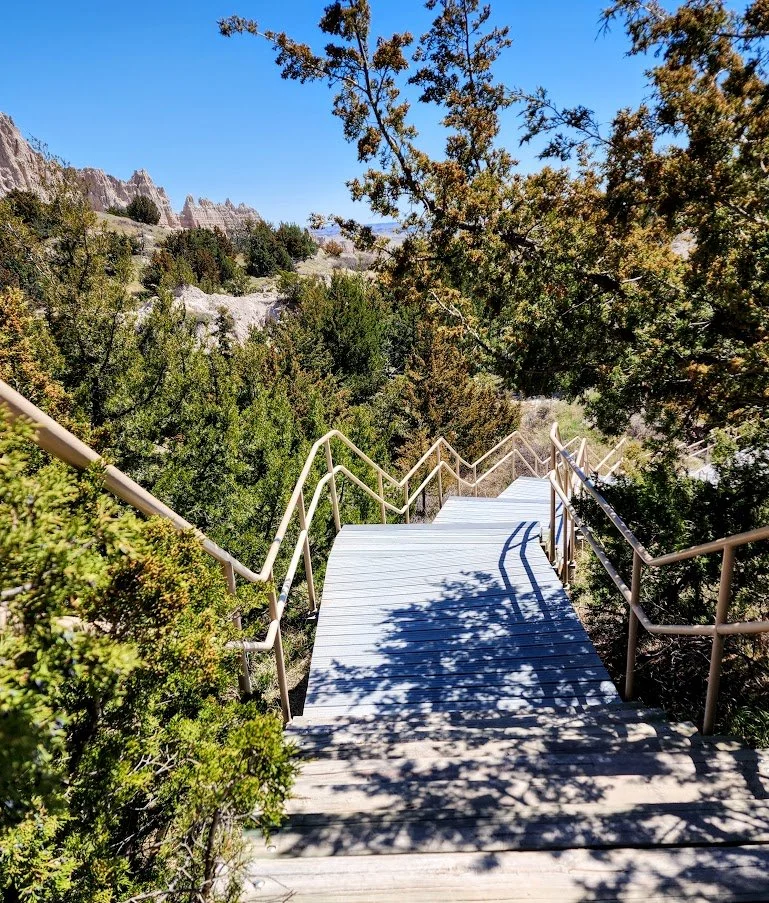This moderate half mile loop follows boardwalks and climbs stairs through a juniper forest along the Badlands Wall. The cliff shelf directs water into this area which allows for more vegetation and wildlife to thrive here. Over 100 different species of birds have been identified here. When entering the park they will give you a map and show you how to get to this trail. This is a nice trail when it is really hot in the Badlands, since some of it is in the shade.
