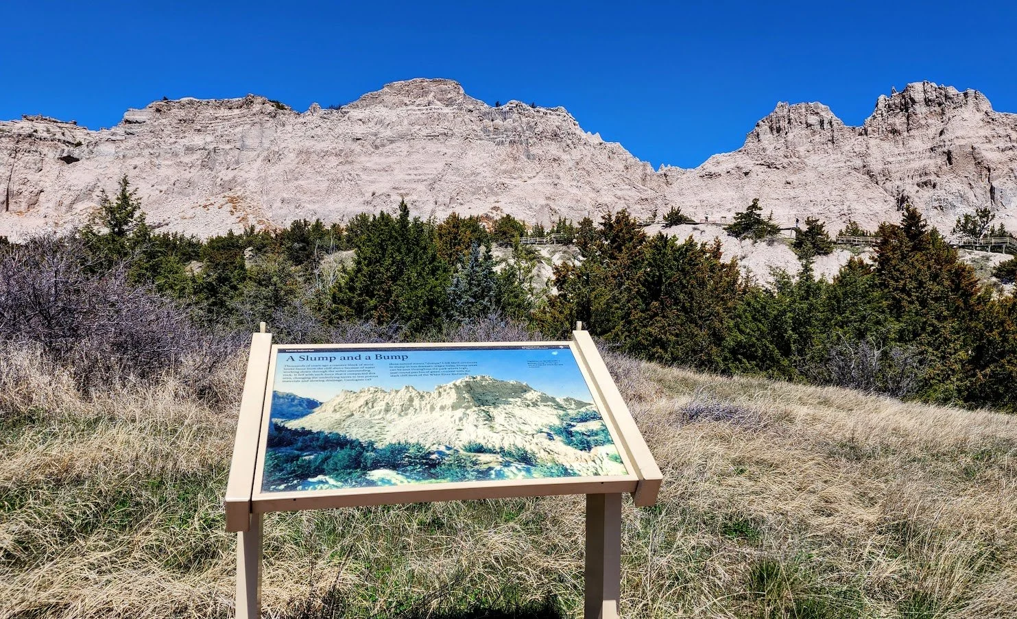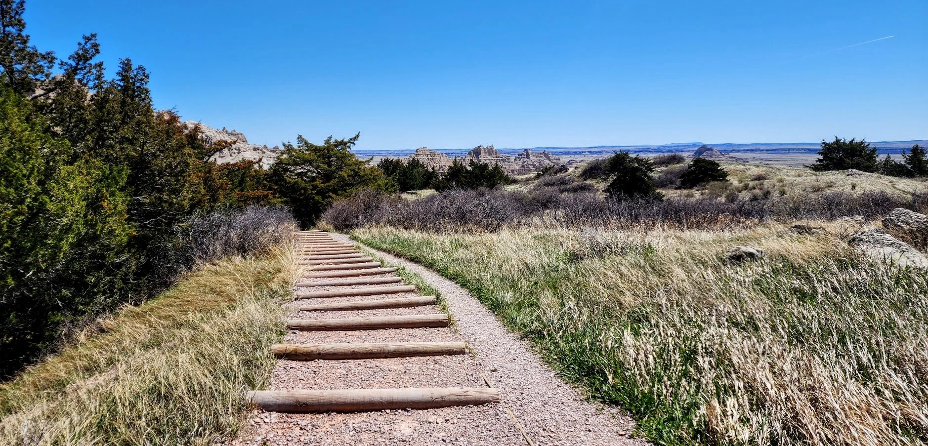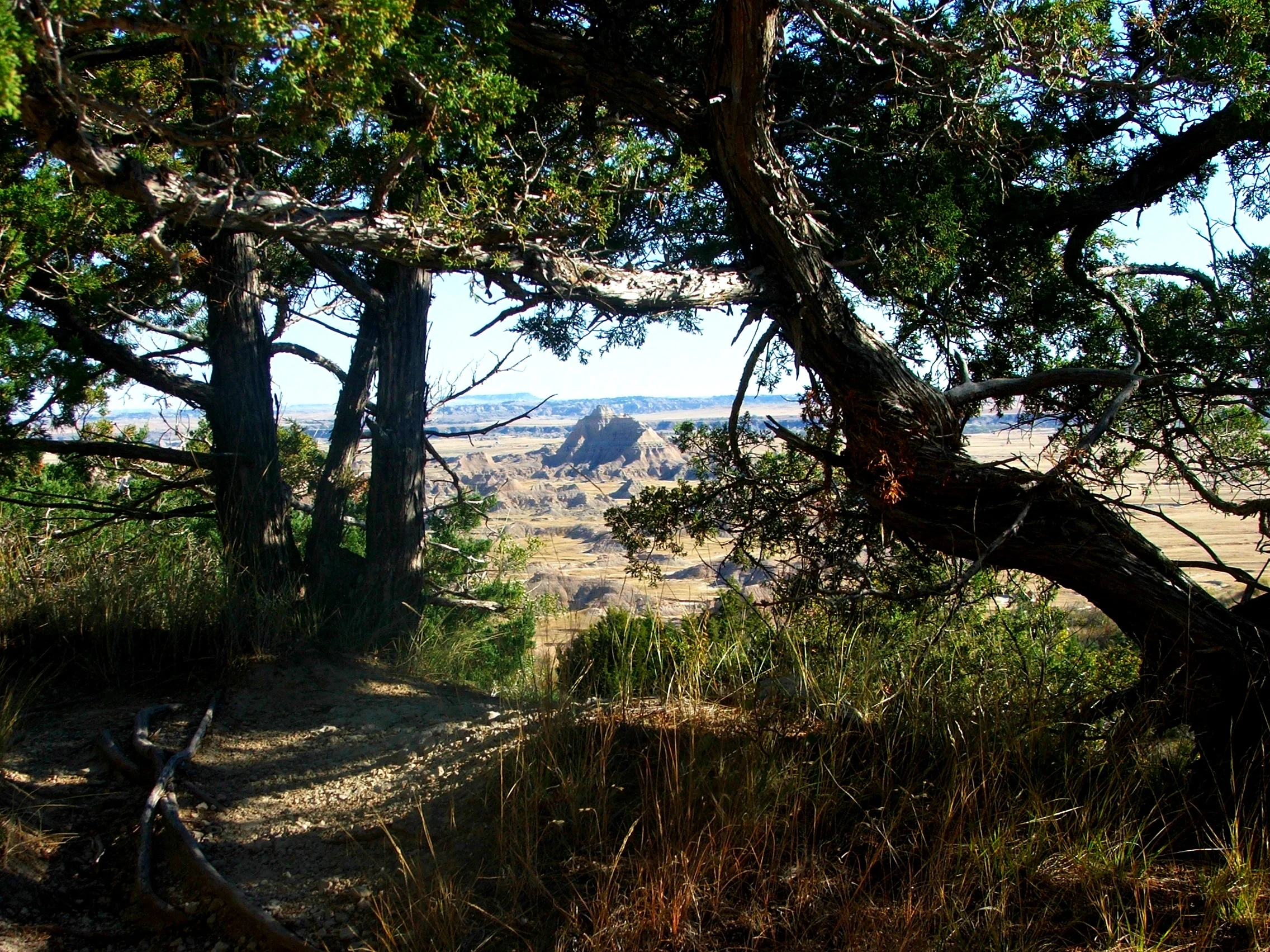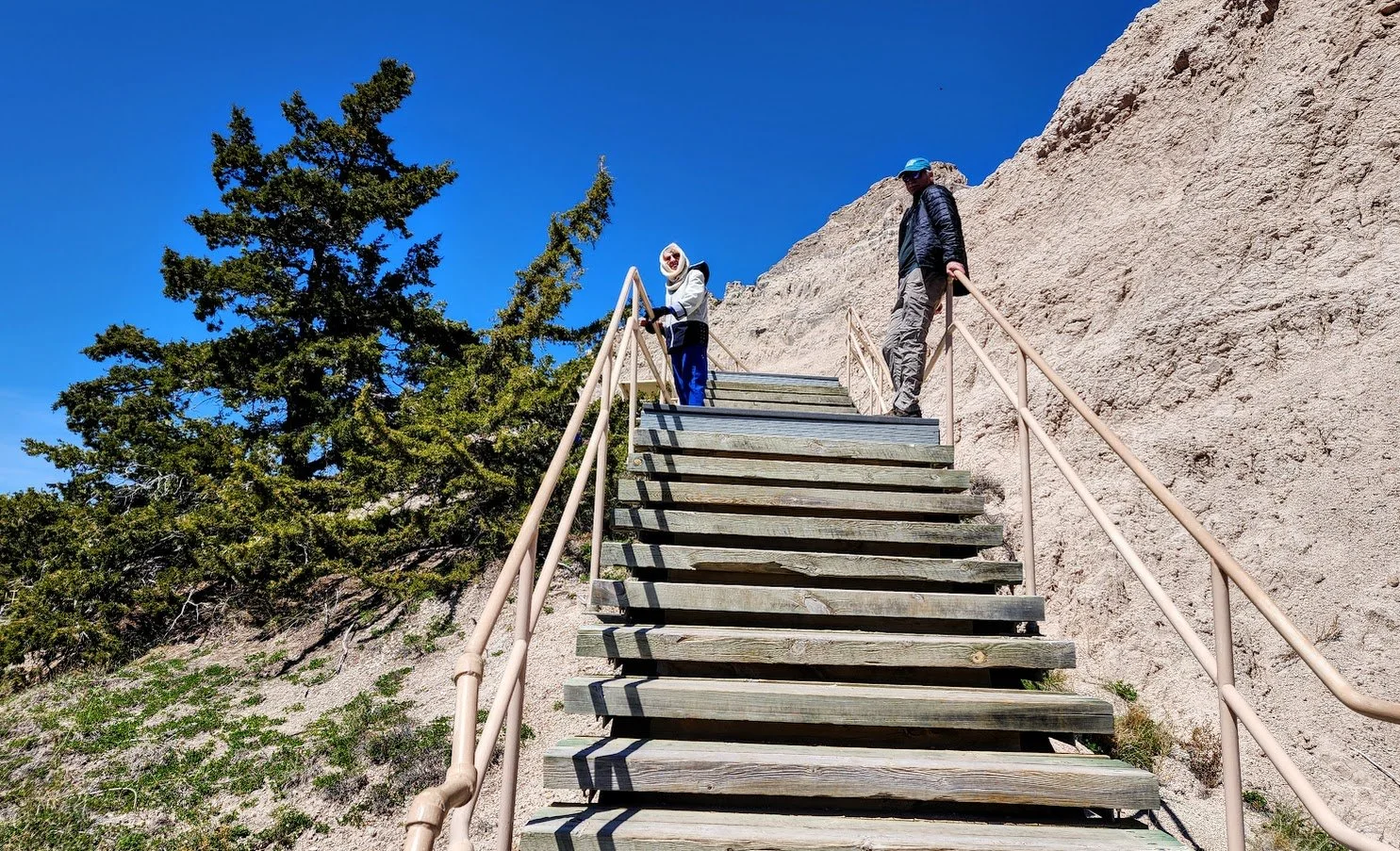 This moderate half mile loop follows boardwalks and climbs stairs through a juniper forest along the Badlands Wall. The cliff shelf directs water into this area which allows for more vegetation and wildlife to thrive here. Over 100 different species of birds have been identified here. When entering the park they will give you a map and show you how to get to this trail. This is a nice trail when it is really hot in the Badlands, since some of it is in the shade.