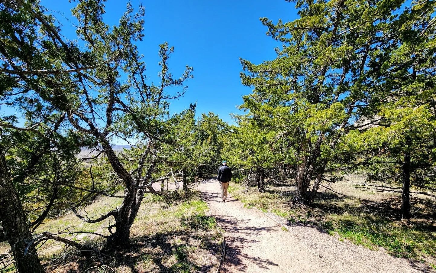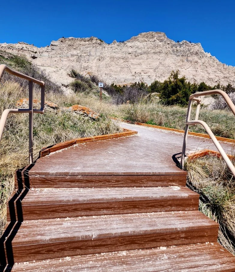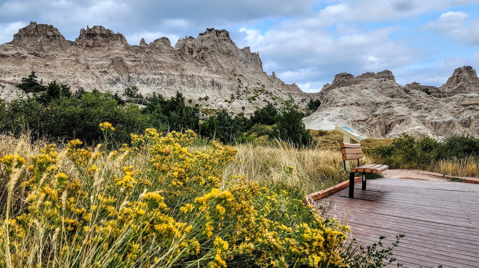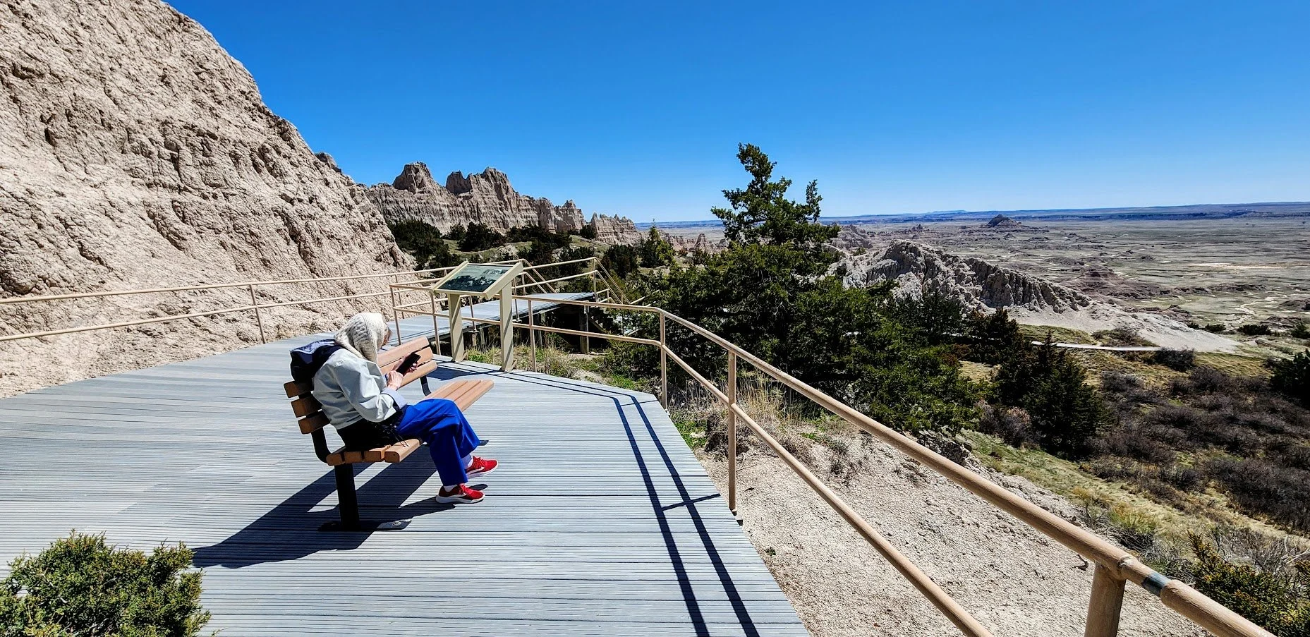 This moderate half mile loop follows boardwalks and climbs stairs through a juniper forest along the Badlands Wall. The cliff shelf directs water into this area which allows for more vegetation and wildlife to thrive here. Over 100 different species of birds have been identified here. When entering the park they will give you a map and show you how to get to this trail. This is a nice trail when it is really hot in the Badlands, since some of it is in the shade.