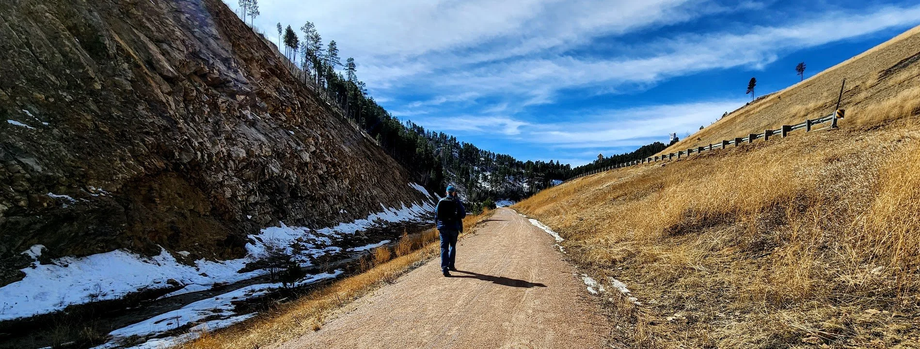 The trail between Deadwood and the Kirk Trailhead is 3.5 miles. We decided to walk this trail both ways this time instead of bike riding since there was still a lot of snow on the trail at times. The thing about walking it instead is you get to enjoy the scenery longer, and notice a lot more things you may otherwise miss. The trail takes you on the outskirts of Deadwood, pass the Lead sign, and then follows the outskirts of the Homestake Mine. There are some informative signs along the way that explains the history of the Homestake Mine. The trail ends at the Kirk Trailhead where there is a pot toilet, picnic table, and bench. From there you can choose which trailhead to continue on, or go back to Deadwood.