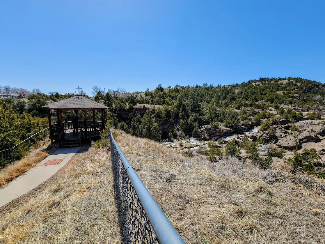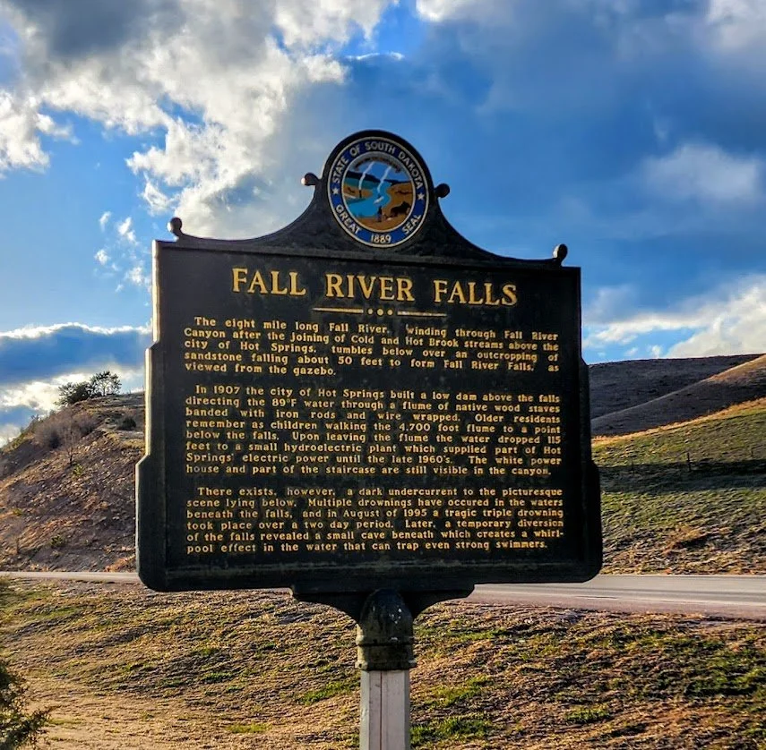 Fall River Falls is located about .75 of a mile west of the intersection of Highway 79 and Highway 18/385/Fall River Rd. It is on the way to Hot Springs, and next to Saint Johns Lutheran Church Elca. There is a place to park at the church and then you walk down a small pathway near another smaller church to get to the gazebo and viewing above the falls. There is information on sight about the dangers of the falls, and they do ask for donations when you visit to help maintain the grounds.