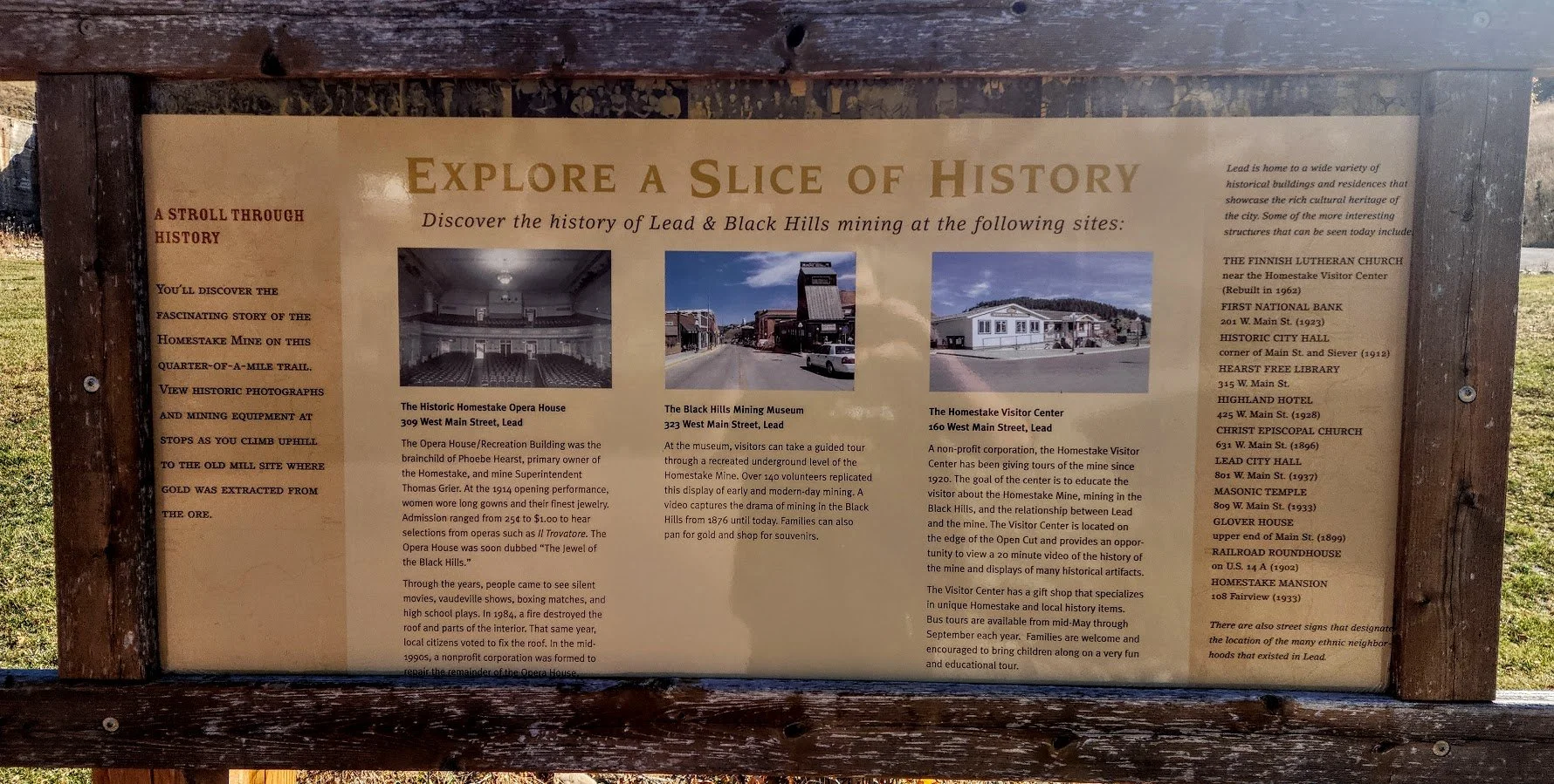 The Gold Run Park Interpretive Trail is a .34 miles out and back concrete trail located in Lead, South Dakota. The trail is constructed on the site of the Homestake Mine’s gold mills. The trail is full of information and interesting displays. There is a restroom on site, and in the fall this trail is especially pretty. The trail may be closed during the winter months.