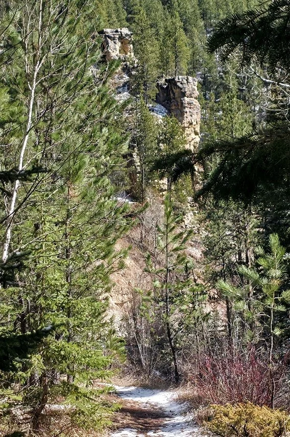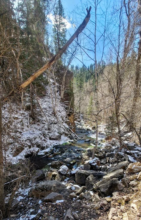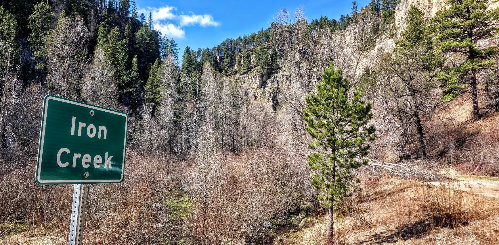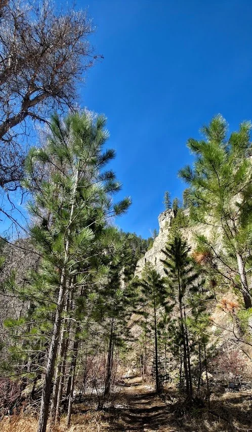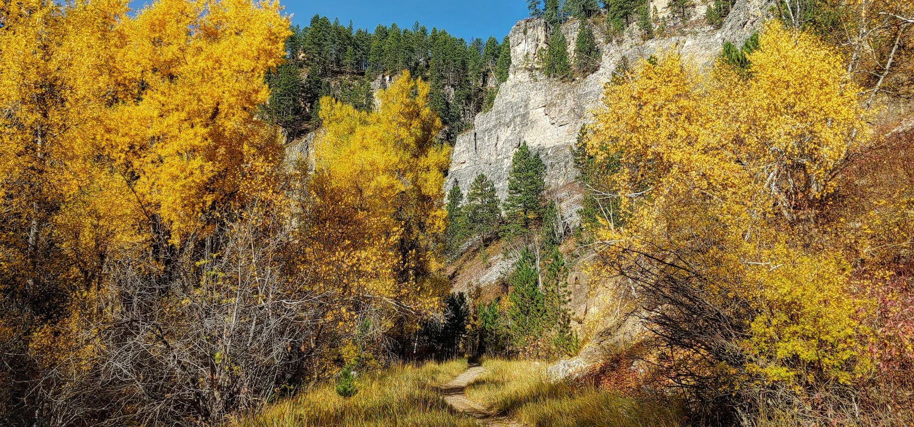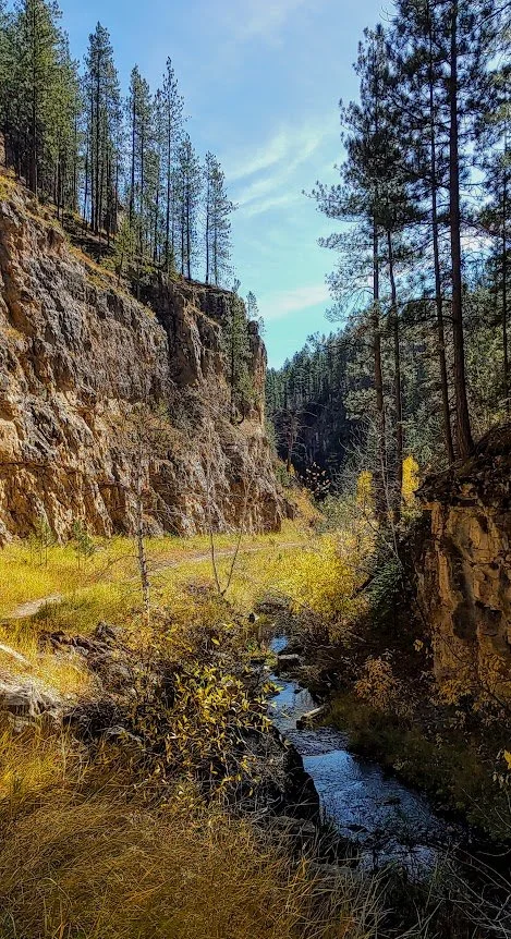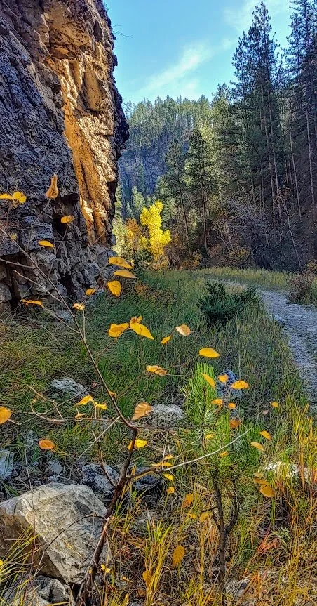 Iron Creek Trail is in Spearfish Canyon and is located a few miles past Bridal Veil Falls. There is a small pullout parking lot at the beginning of the trail which starts right near the road and the Iron Creek Sign. This trail is easy (around 2.5 miles round trip there and back), and has little elevation gain. The trail follows the creek and is surrounded by cliffs, and trees. In the fall it is absolutely gorgeous. The kids will like this trail because there is plenty of things to see to keep them entertained and a lot of places to get in the water and cool off. After walking about a mile there is a spot where you can turn around if you choose. The creek begins to dry out after this and the trail gets narrower. The trail goes for about another 1/4 mile and ends at a road where there was a potty toliet. Unless you like to see where the trail ends, like the exercise, or need to use the toliet, the last 1/4 mile wasn’t anything special.