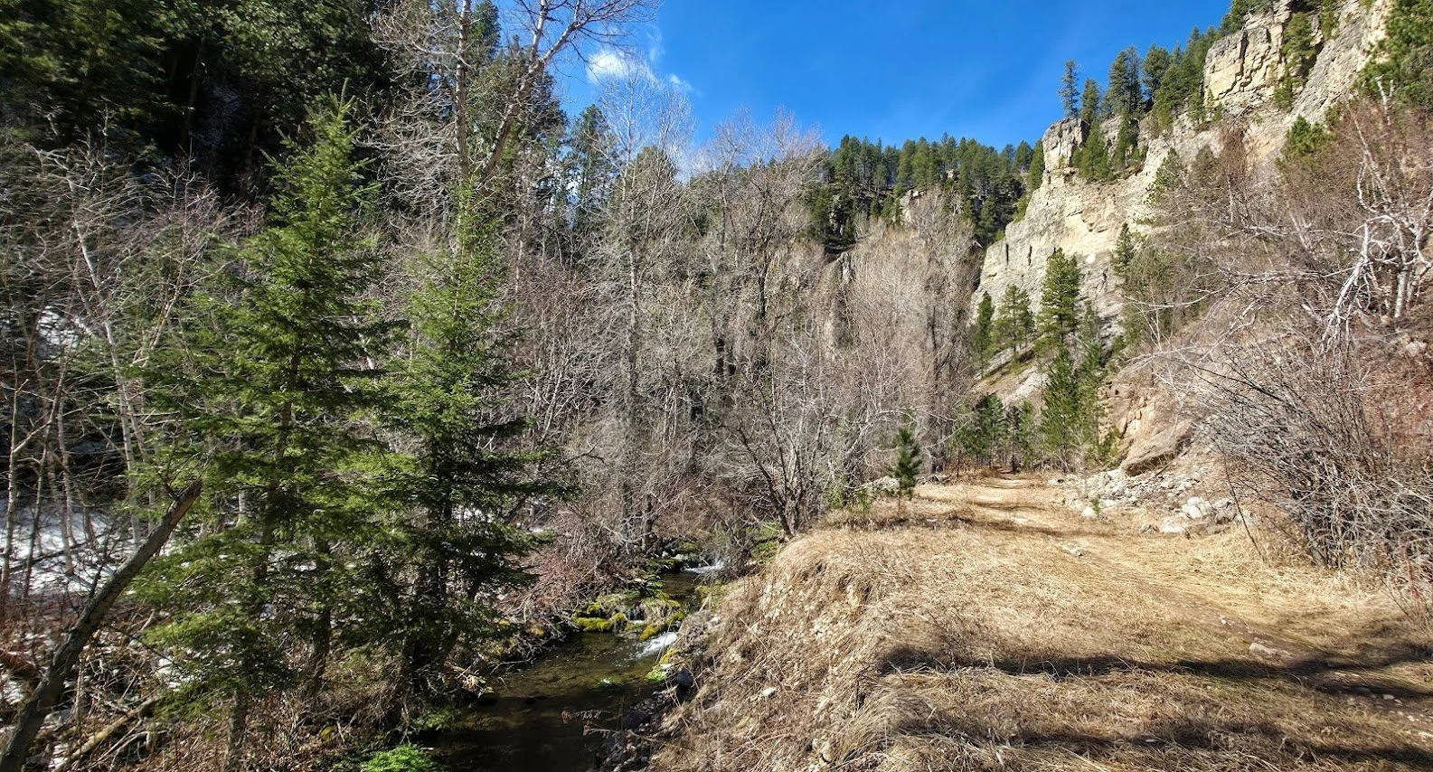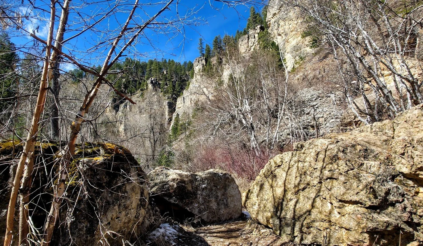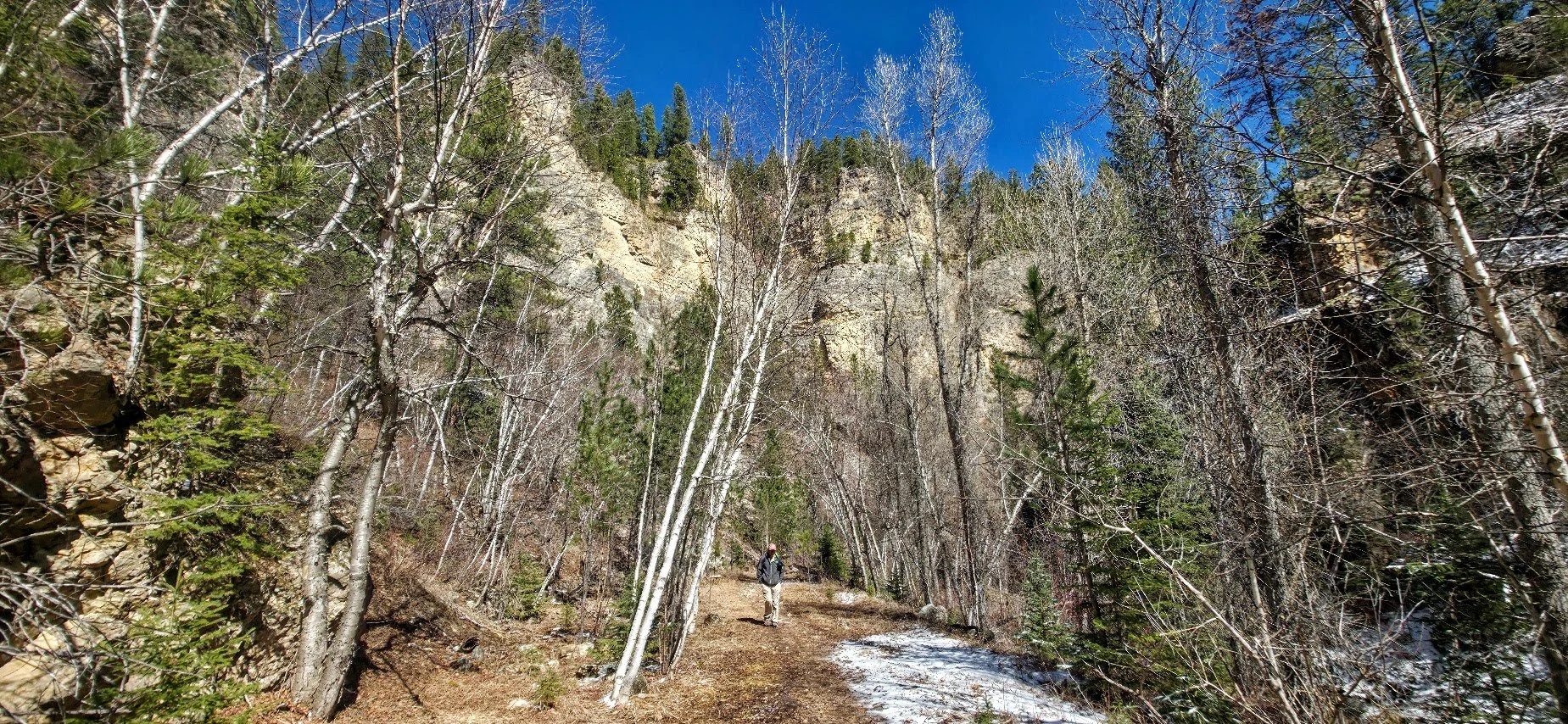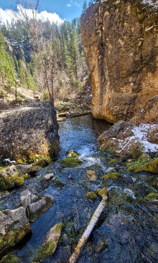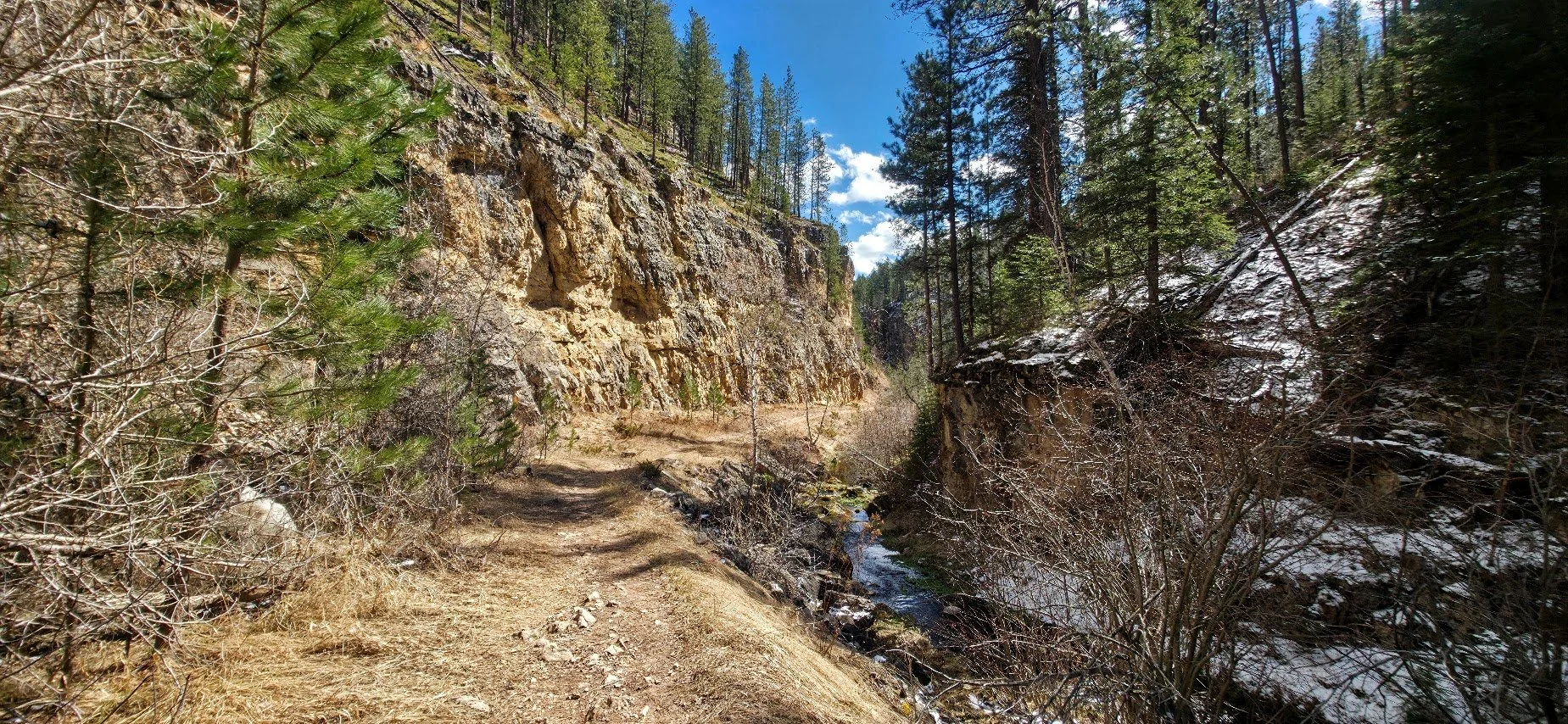 Iron Creek Trail is in Spearfish Canyon and is located a few miles past Bridal Veil Falls. There is a small pullout parking lot at the beginning of the trail which starts right near the road and the Iron Creek Sign. This trail is easy (around 2.5 miles round trip there and back), and has little elevation gain. The trail follows the creek and is surrounded by cliffs, and trees. In the fall it is absolutely gorgeous. The kids will like this trail because there is plenty of things to see to keep them entertained and a lot of places to get in the water and cool off. After walking about a mile there is a spot where you can turn around if you choose. The creek begins to dry out after this and the trail gets narrower. The trail goes for about another 1/4 mile and ends at a road where there was a potty toliet. Unless you like to see where the trail ends, like the exercise, or need to use the toliet, the last 1/4 mile wasn’t anything special.