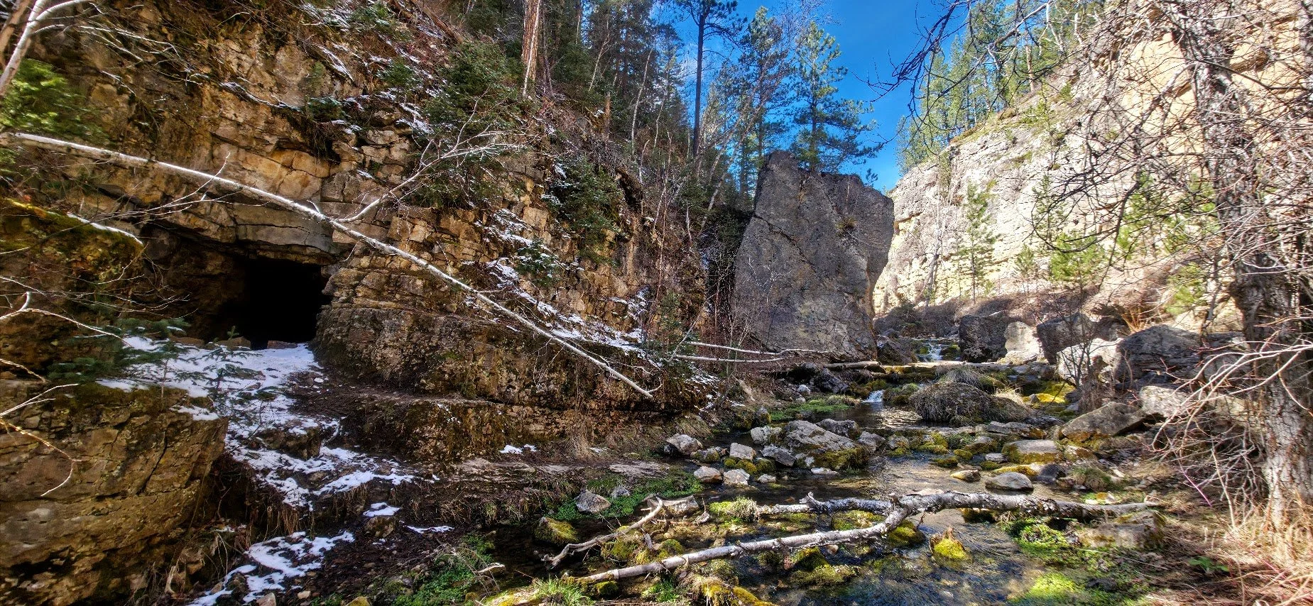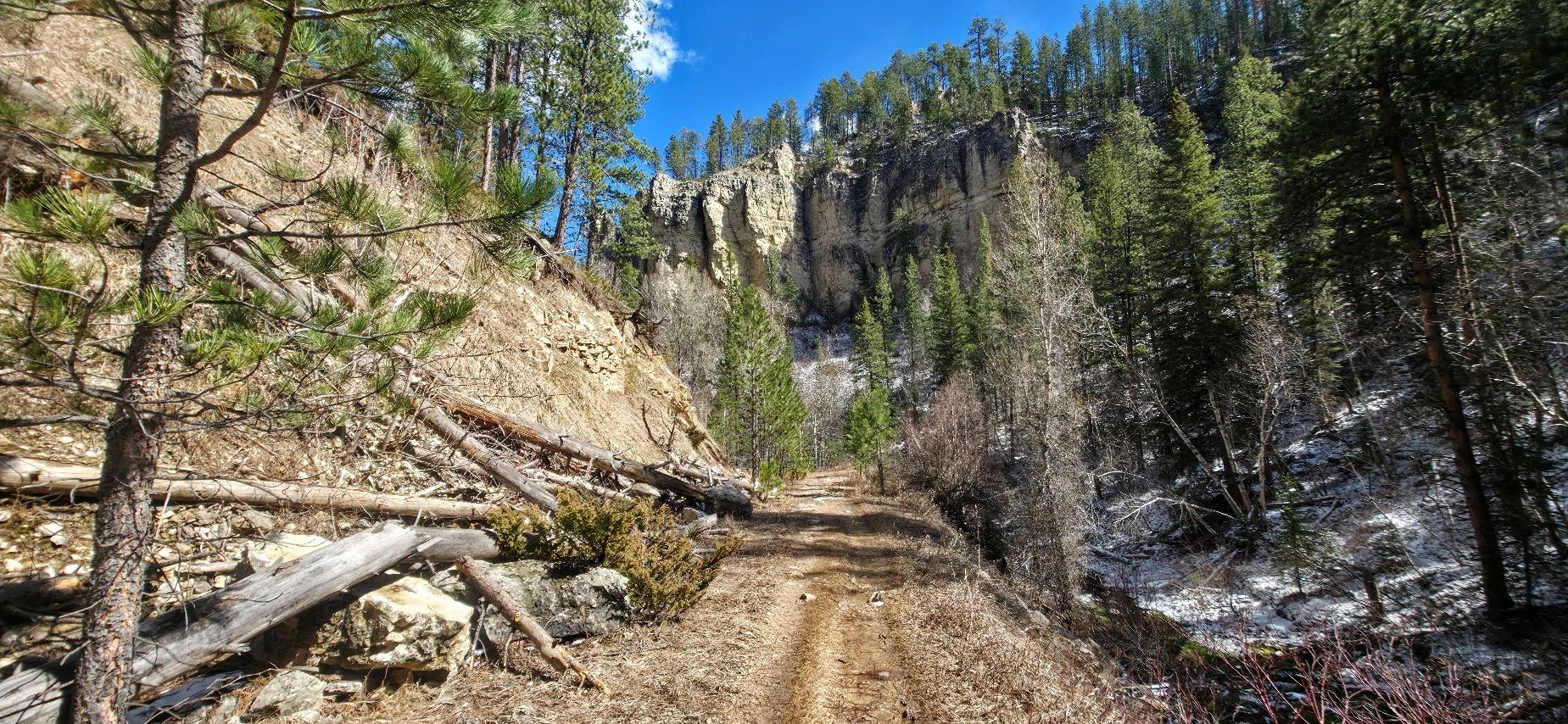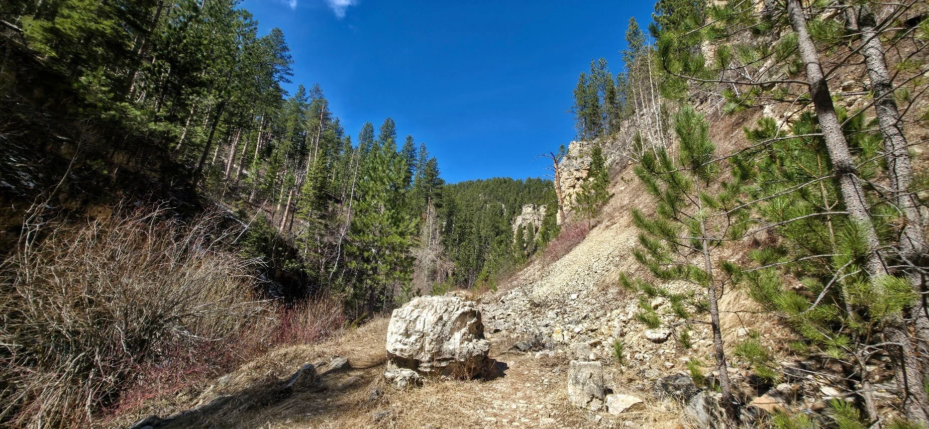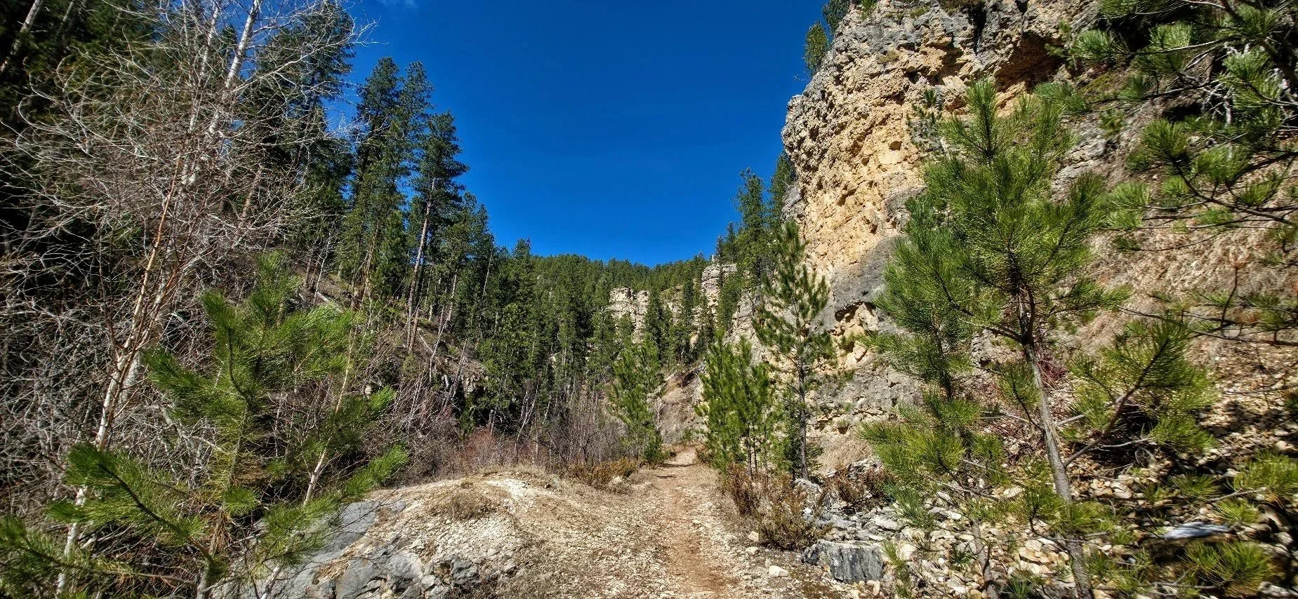 Iron Creek Trail is in Spearfish Canyon and is located a few miles past Bridal Veil Falls. There is a small pullout parking lot at the beginning of the trail which starts right near the road and the Iron Creek Sign. This trail is easy (around 2.5 miles round trip there and back), and has little elevation gain. The trail follows the creek and is surrounded by cliffs, and trees. In the fall it is absolutely gorgeous. The kids will like this trail because there is plenty of things to see to keep them entertained and a lot of places to get in the water and cool off. After walking about a mile there is a spot where you can turn around if you choose. The creek begins to dry out after this and the trail gets narrower. The trail goes for about another 1/4 mile and ends at a road where there was a potty toliet. Unless you like to see where the trail ends, like the exercise, or need to use the toliet, the last 1/4 mile wasn’t anything special.