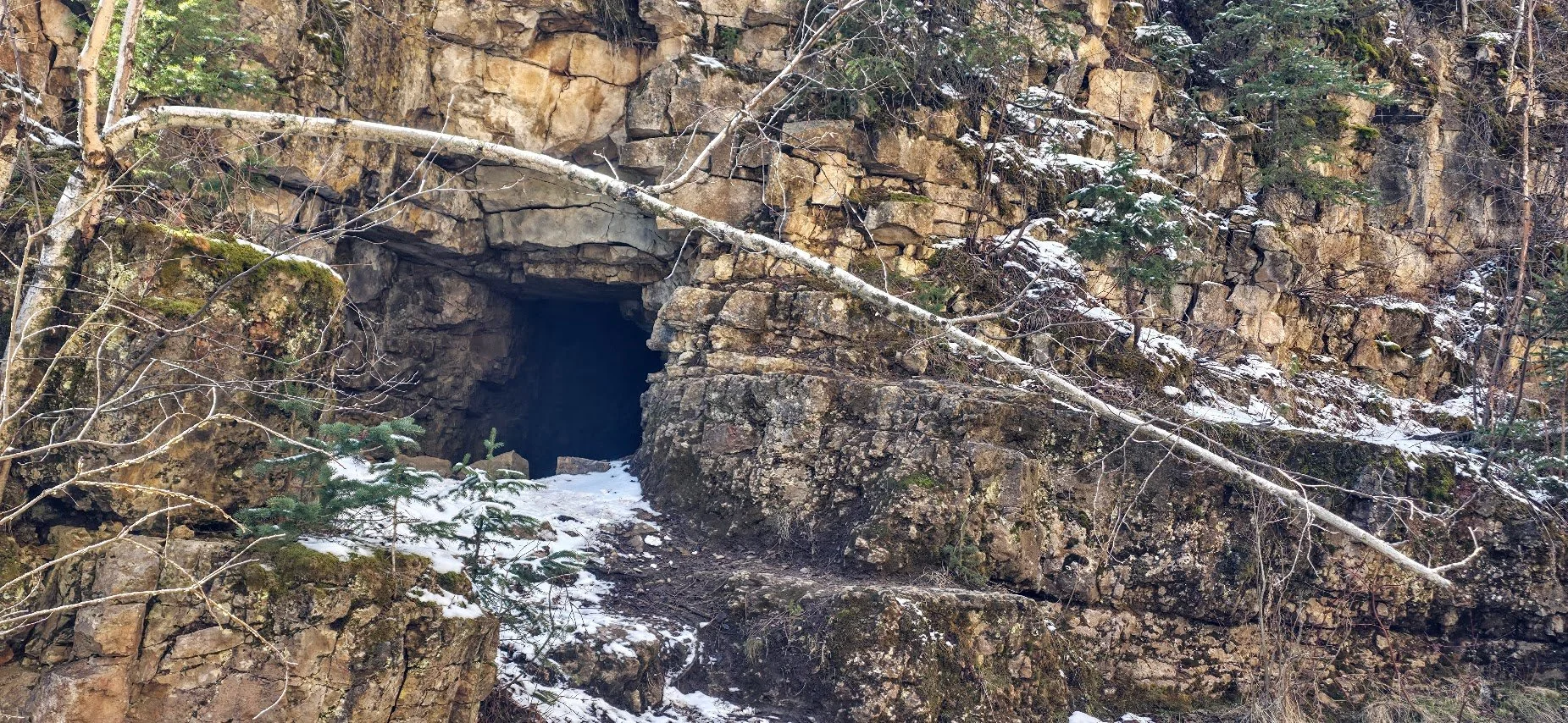 In the cave looking out.