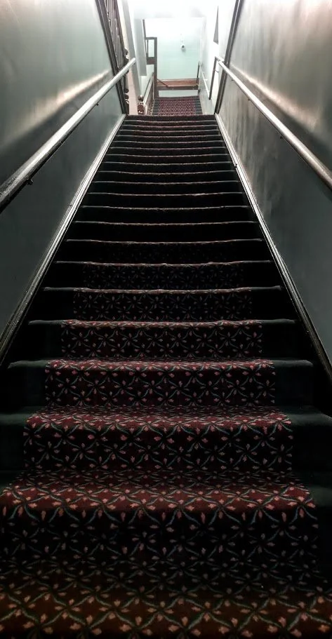 Stairs go up three floors straight. Great exercise.