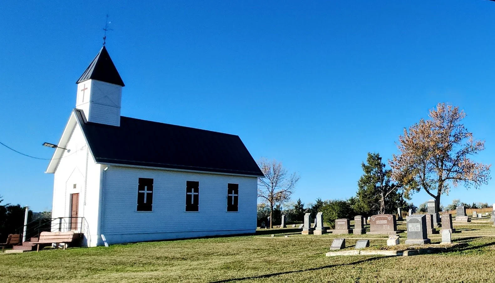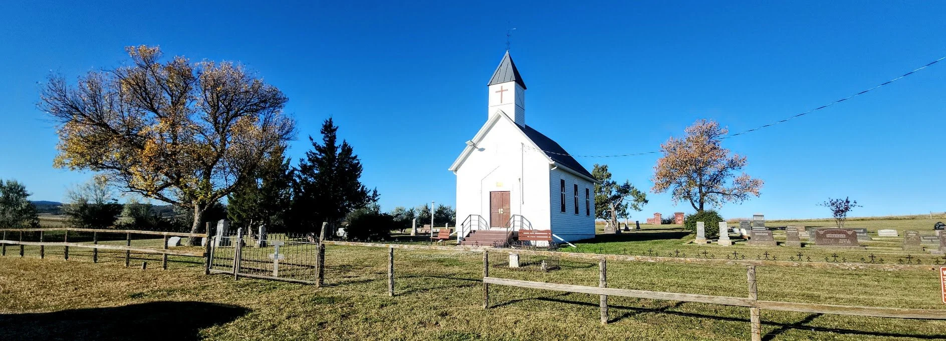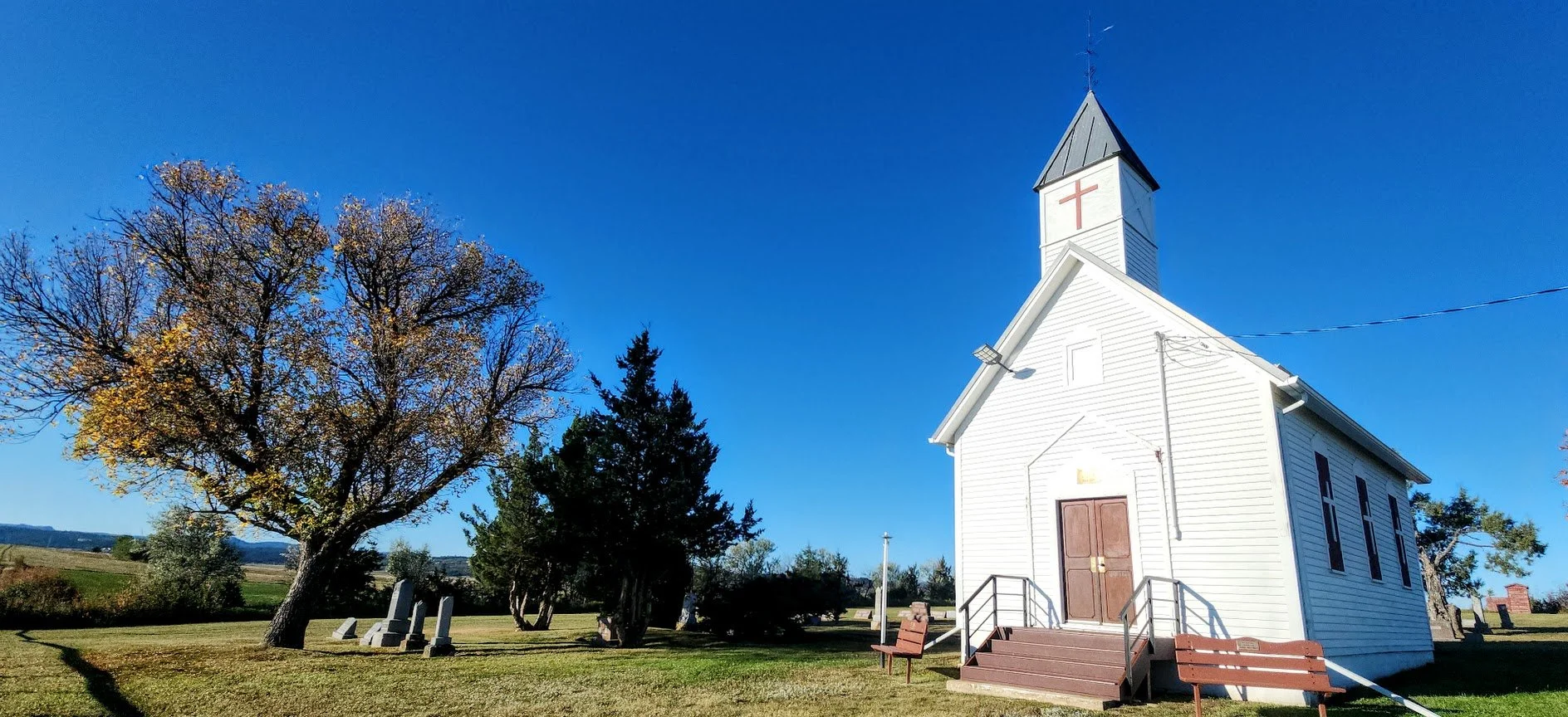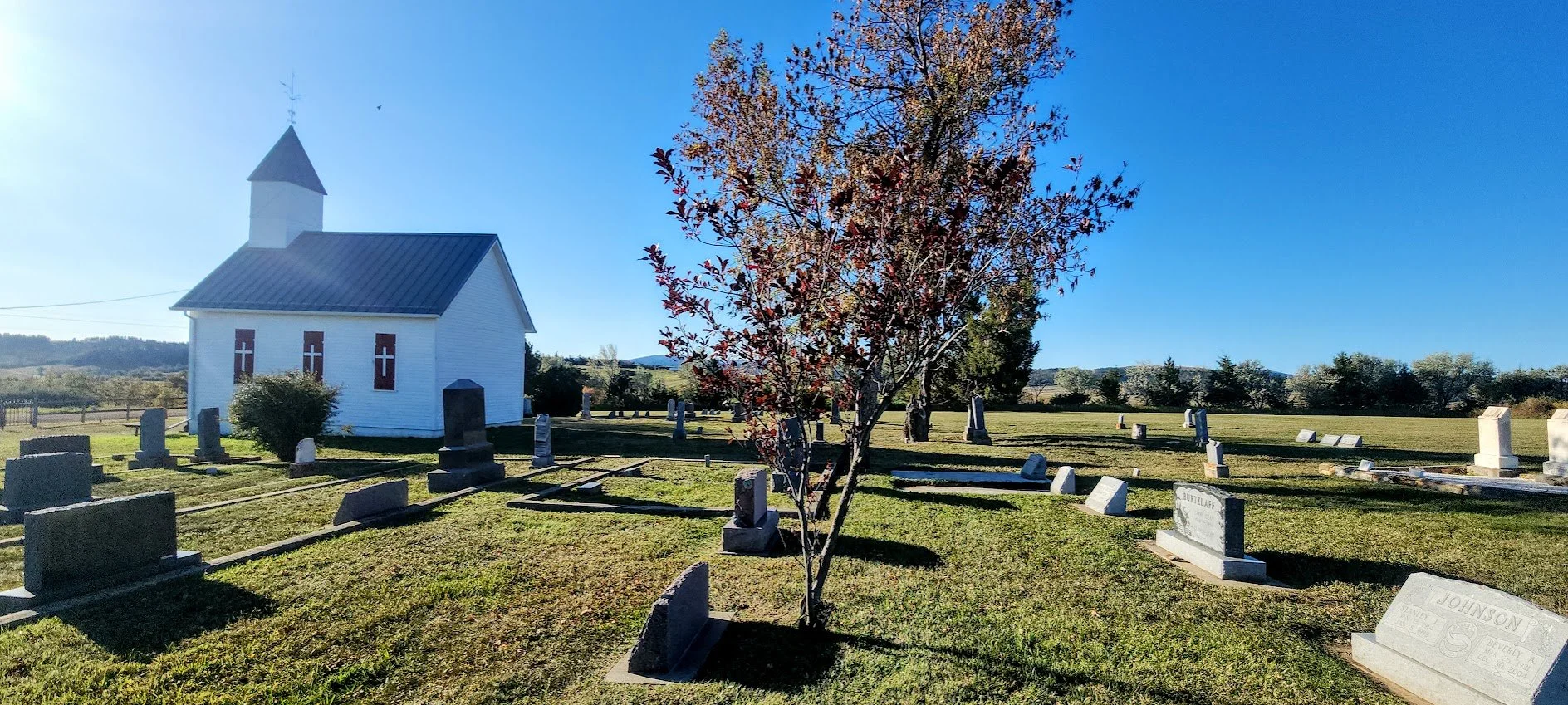 Little Dane Cemetery was constructed in 1897 and 2 years later the church was built. There are around 190 people buried at the cemetery and the only people that can be buried there are descendants of the original plot holders and parishioners of the church. The last service at the church was in 1929 until in 1969 on the 80th anniversary of the church, a newly restored church was dedicated. The church and cemetery are located in Lawrence County off Dane Church Road just north of Highway 34. It is a beautiful church and location, and Bear Butte can be seen in the background.