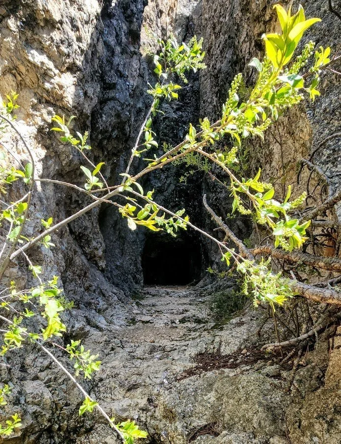 Side trail to a tunnel. Tunnel is right behind the pine trees.