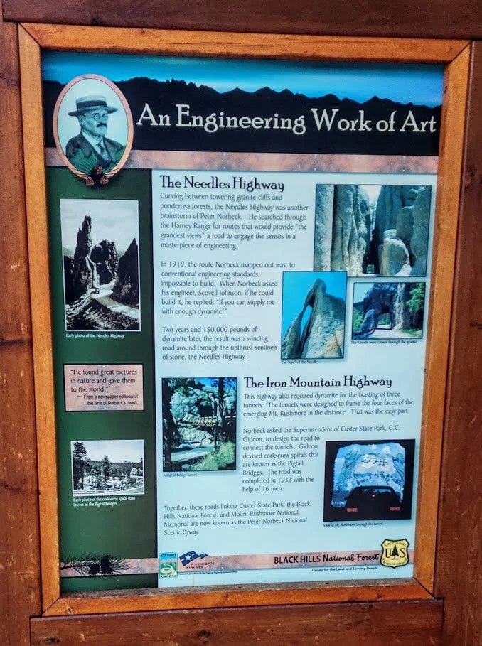Norbeck Overlook is located on Iron Mountain Road which runs between the town of Keystone and Custer State Park. It is 3 miles from Keystone and 5 miles from Custer State Park. The overlook takes you to a couple of great views of Mount Rushmore, and it has some informative displays about different things you will see in the area.