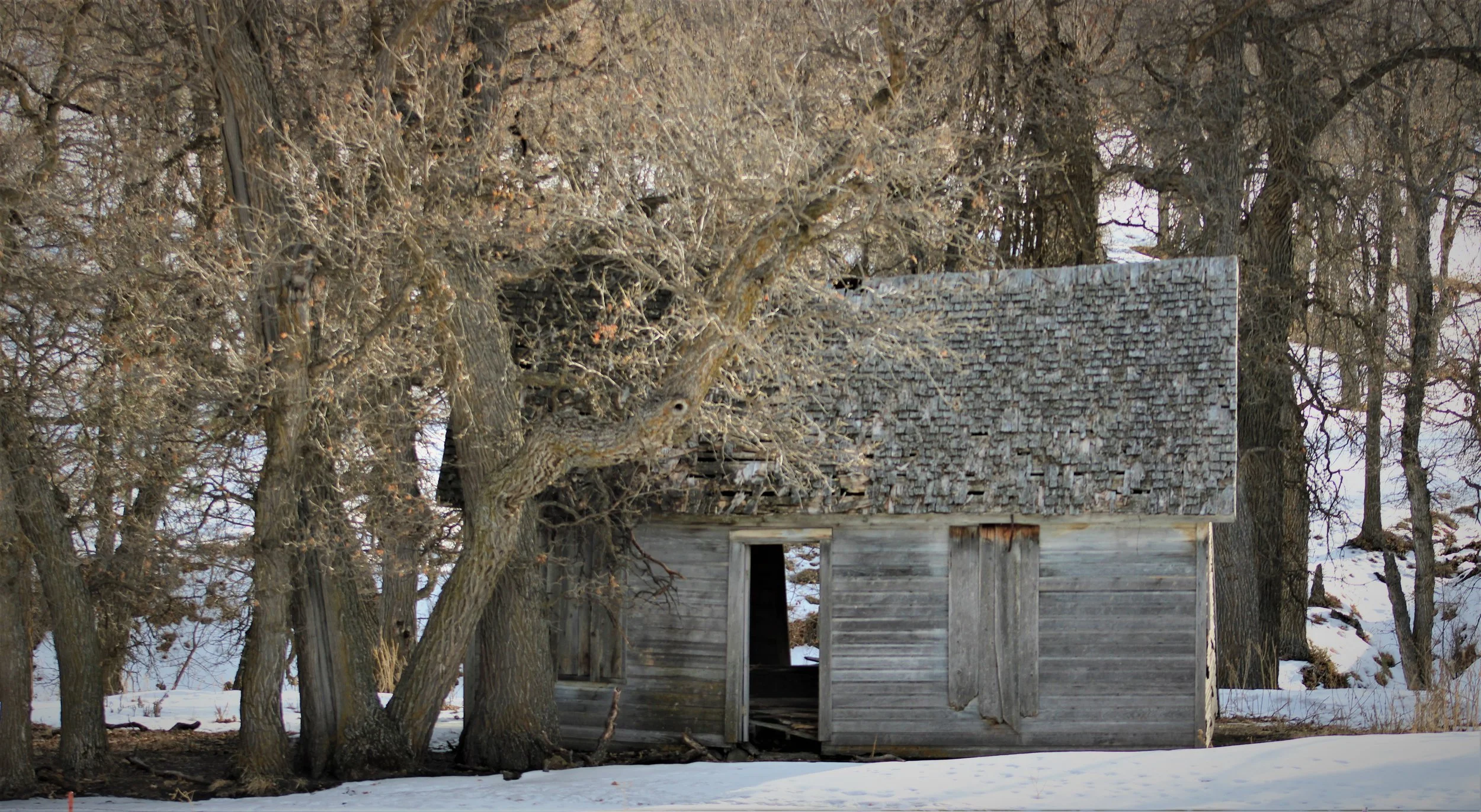 On Highway 14 northwest of the town of Sundance, Wyoming. Looks like an old schoolhouse - now the Sunny Divide Community Hall.