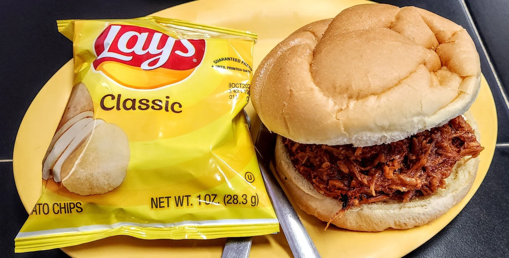 BBQ pork sandwich with coleslaw and chips.