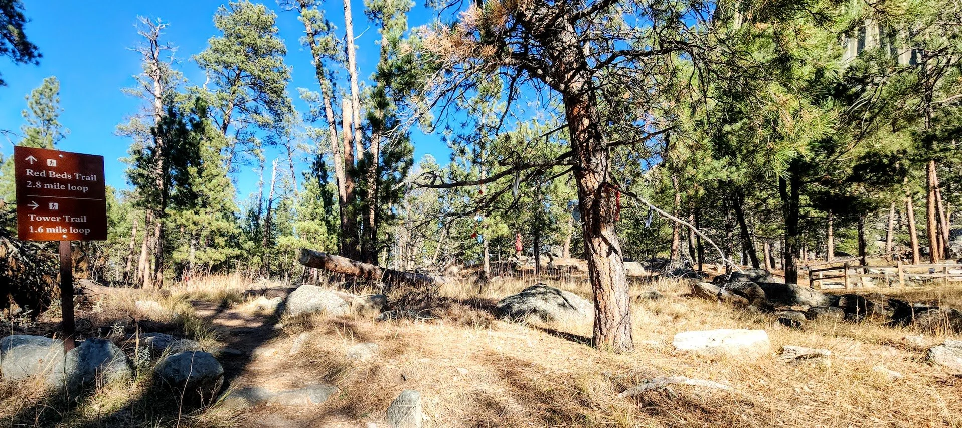Can continue on the Red Beds Trail or do the Tower Trail first, circle around, and then continue back on the Red Beds Trail for a longer hike.