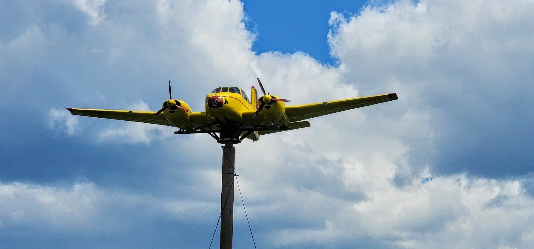 This airplane is located by MM 199 near Sundance, Wyoming. The plane is actually a windsock which turns with the wind. It’s called the Quaal Windsock which honors the people who created it. The plane is a 1950’s Beechcraft Twin Bonanza which sits on a 70 foot pole. Both the plane and the propellers can spin which can be quite often with the gusty winds of the Wyoming prairie. Either way it is a fun thing to see when driving through Wyoming and a great conversation piece.