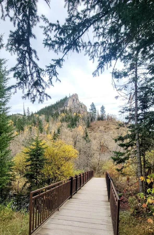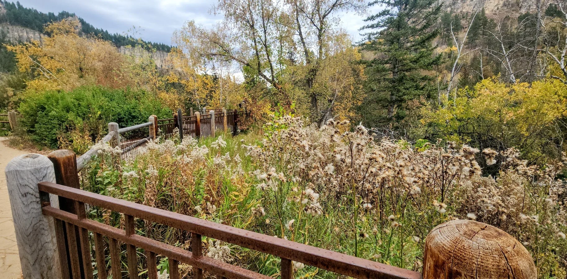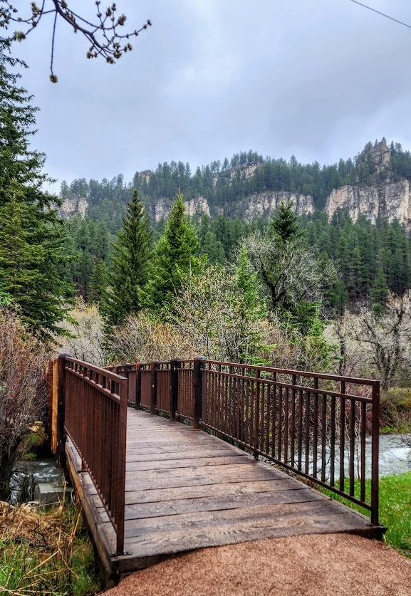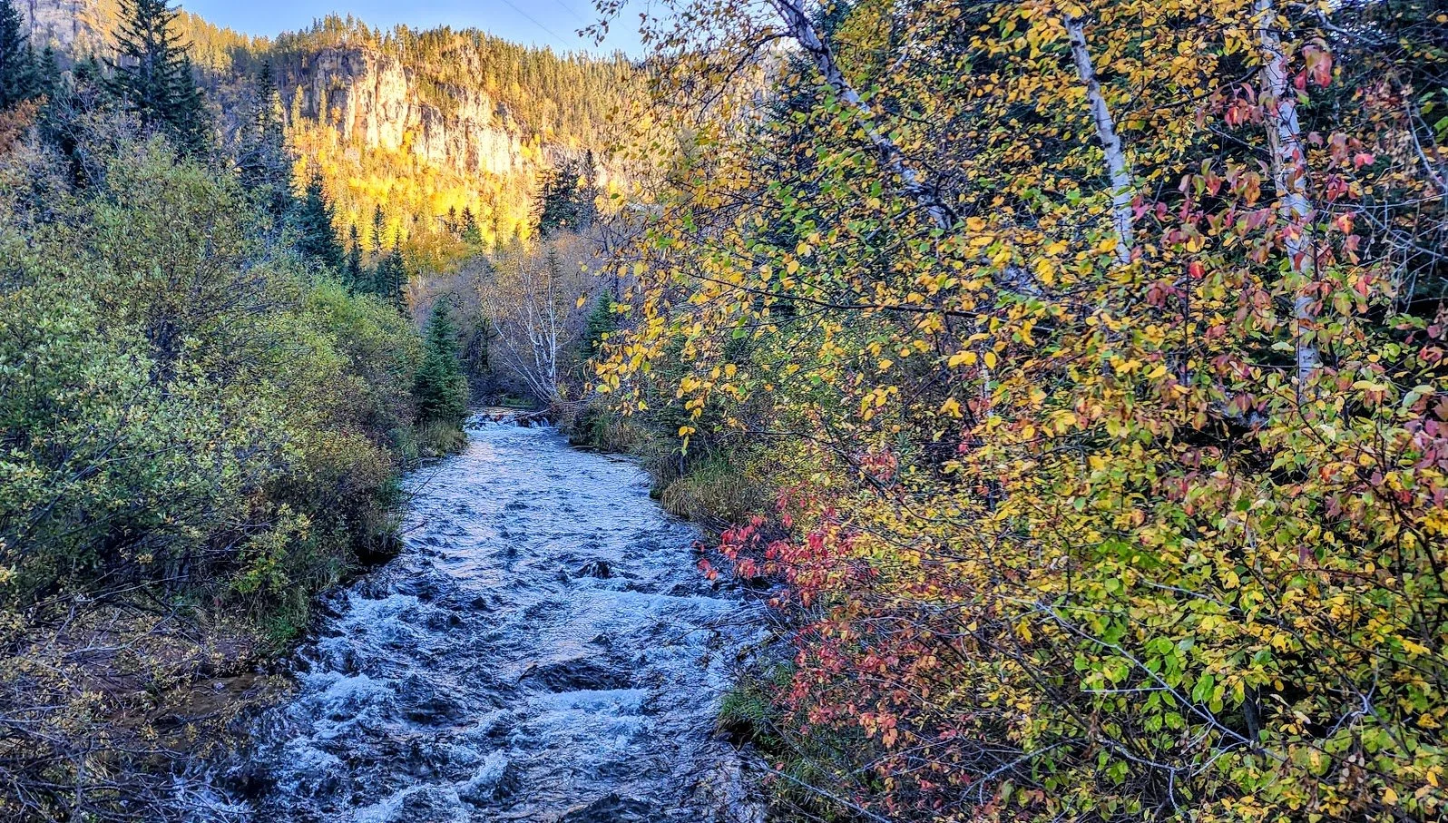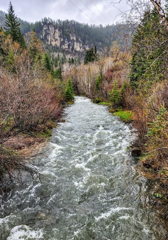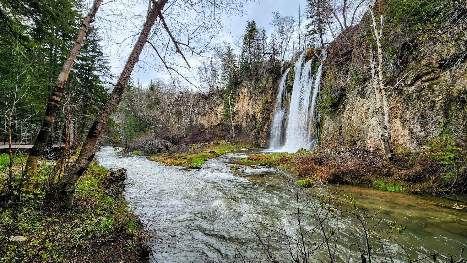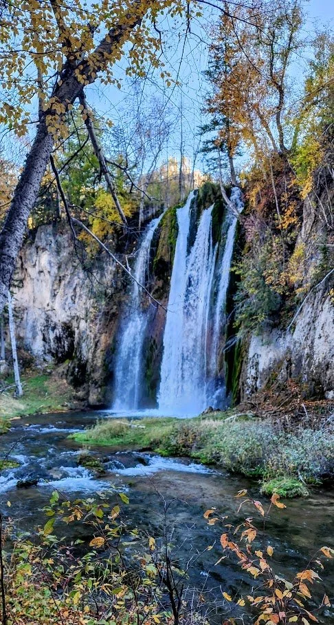 To view the falls, take the Little Spearfish Falls Nature Trail which is found behind the Latchstring Inn in Spearfish Canyon. The trail is 3/4 of a mile out and back that descends a little over 100 feet. This trail is handicap accessible and open year round.