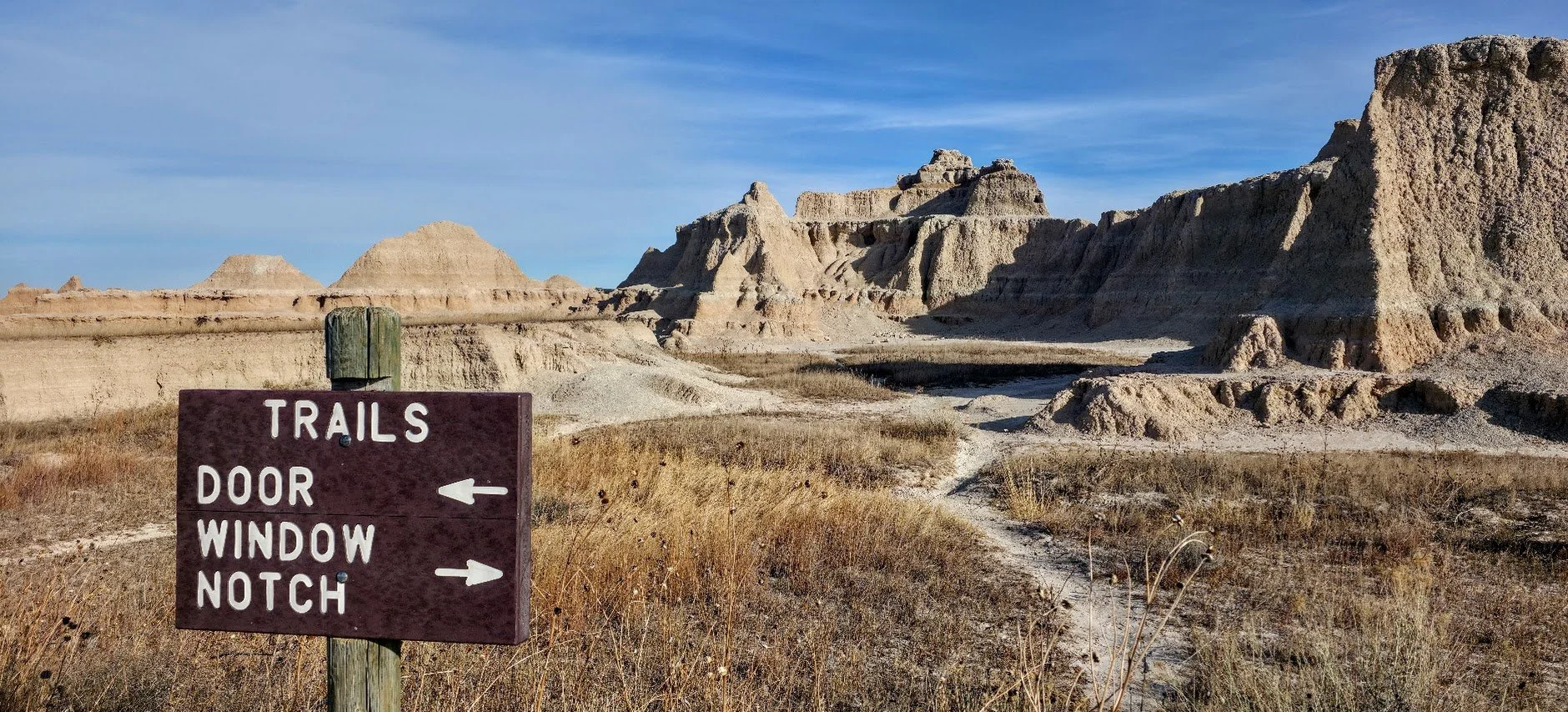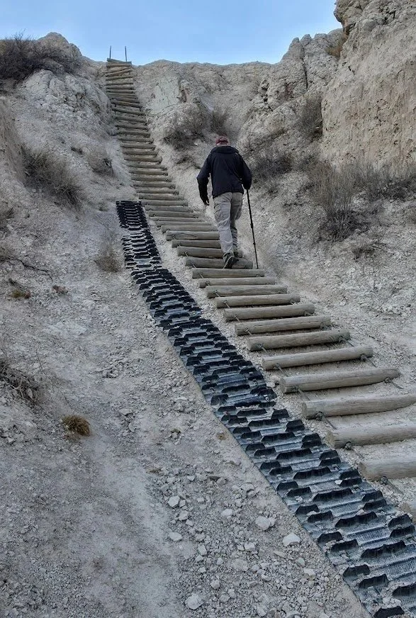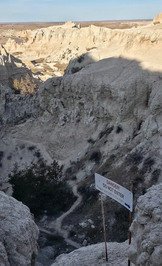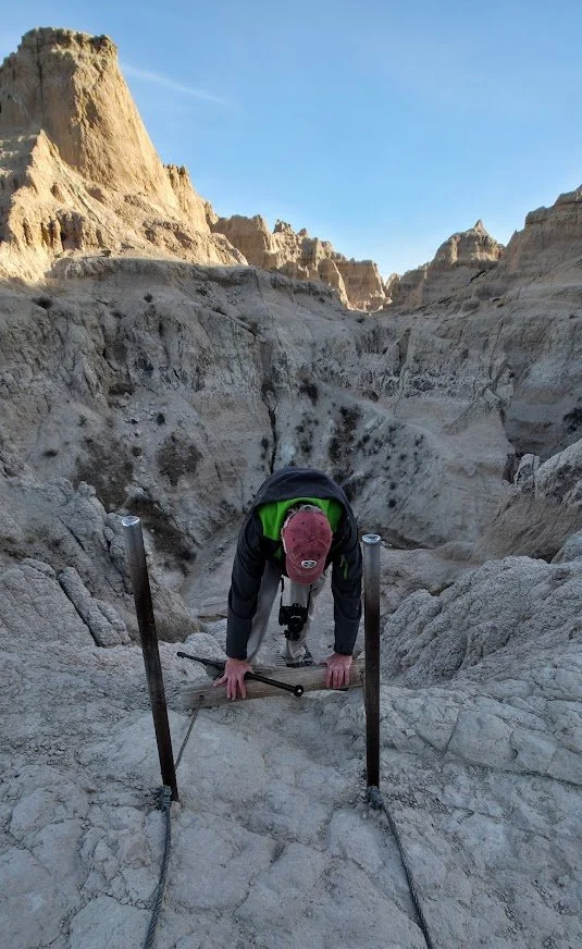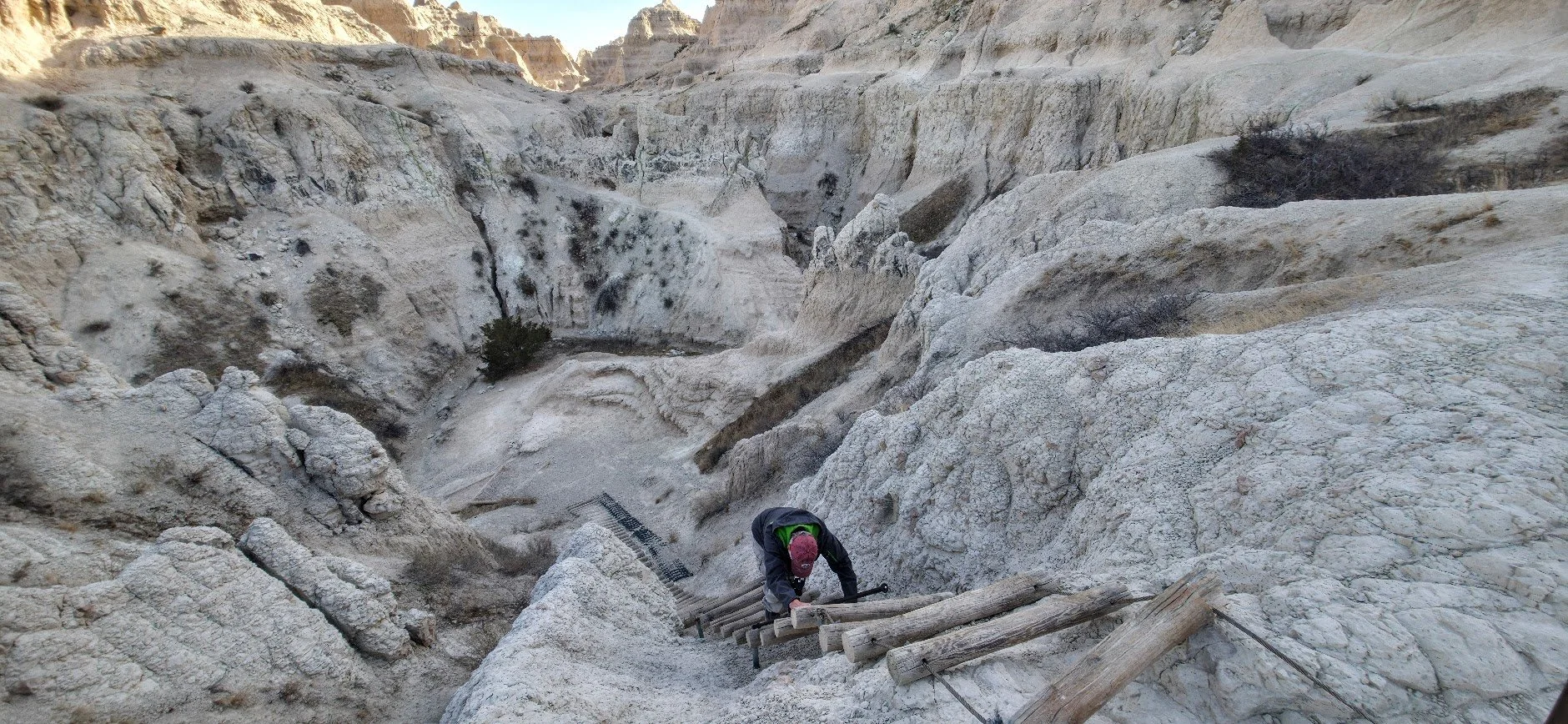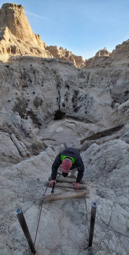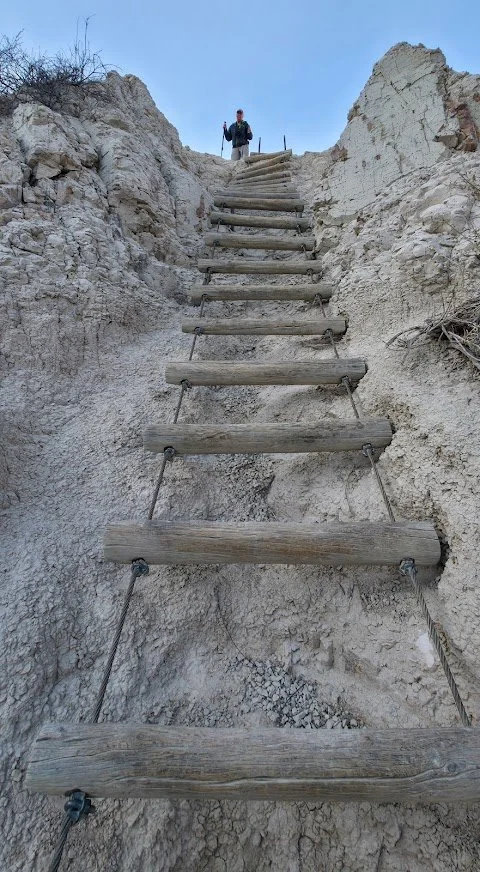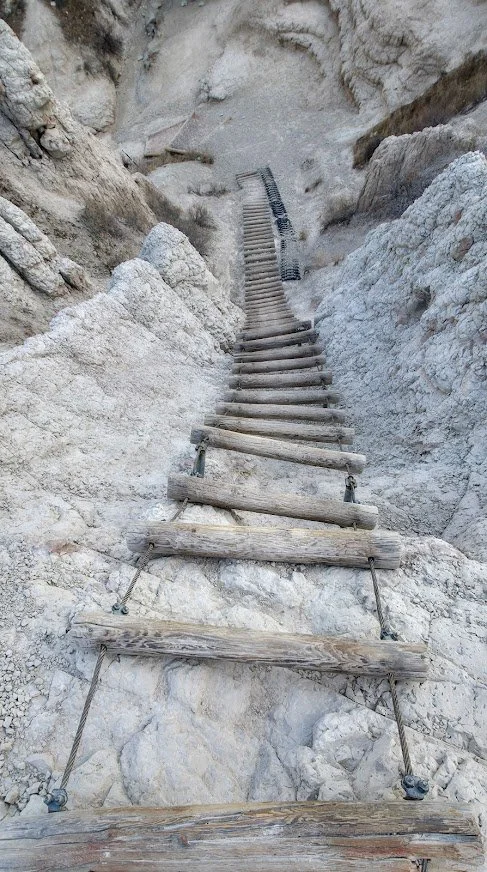 The Notch Trail in Badlands National Park in South Dakota is a very neat trail and not for the faint of heart. You get to climb a rope ladder - very scary for some people and the trail is close to cliffs at times. The trail is 1.3 miles out and back round trip, and it ends at a window that faces to the south and gives you a view of the valley below. The hike is a must for those who like a little adventure. This is a fun hike for kids, but you need to use caution.