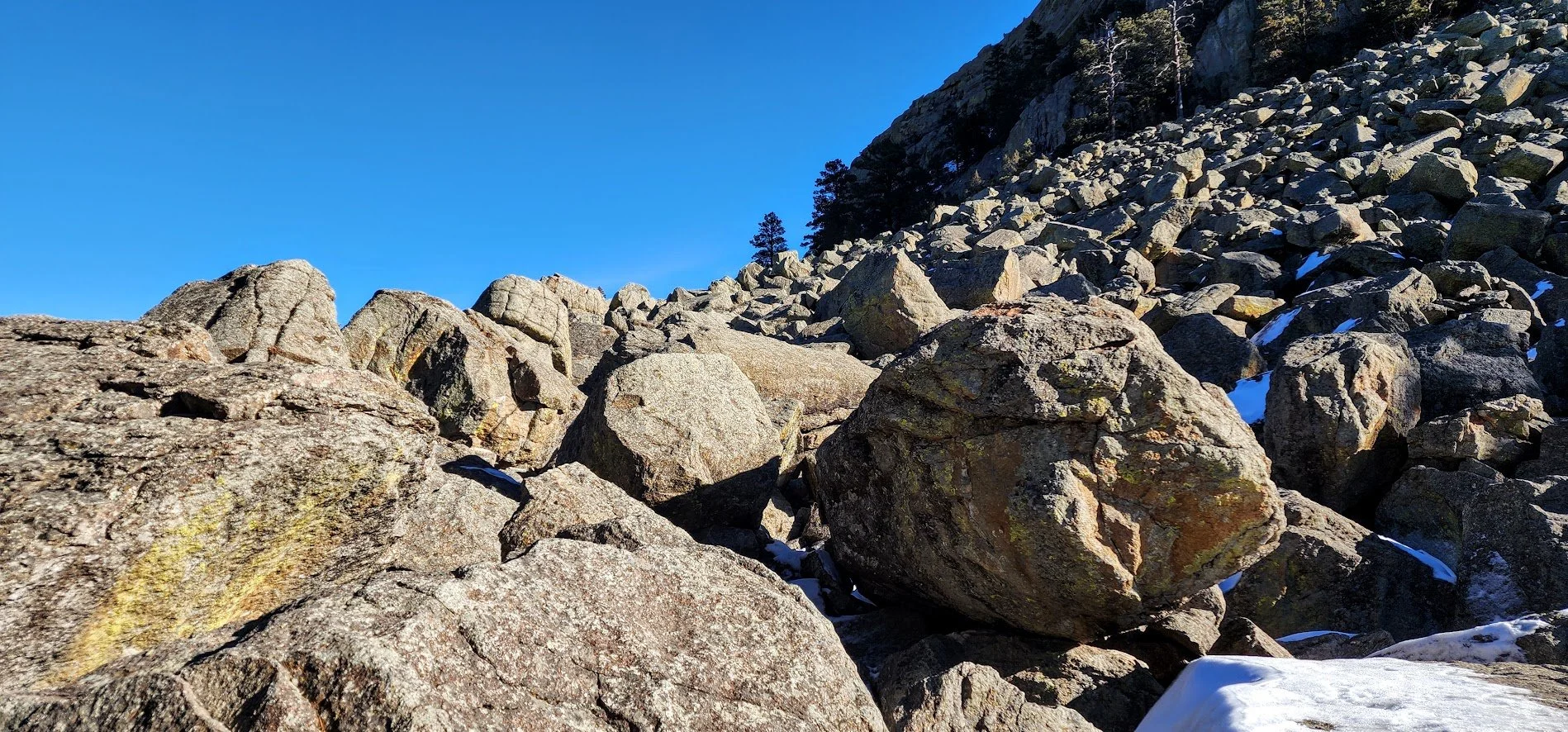 On the east side of the tower, you can get pretty close and even touch the tower without climbing any boulders.
