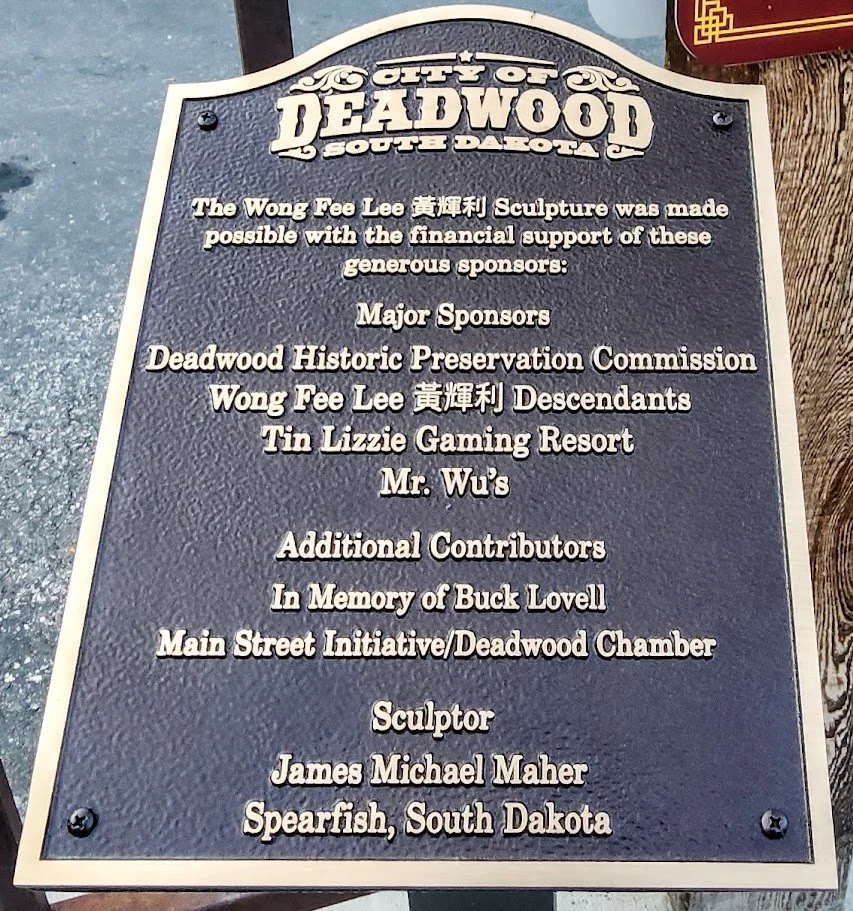 Wong Fee Lee was a Chinese immigrant who arrived in Deadwood in December of 1876. He lived 43 years in Deadwood and became a respected figure in the community. He helped Chinatown to grow and continued his Chinese traditions in Deadwood. On June 26, 2025 they honored him with a statue and proclaimed June 26 as Wong Fee Lee Day in Deadwood.